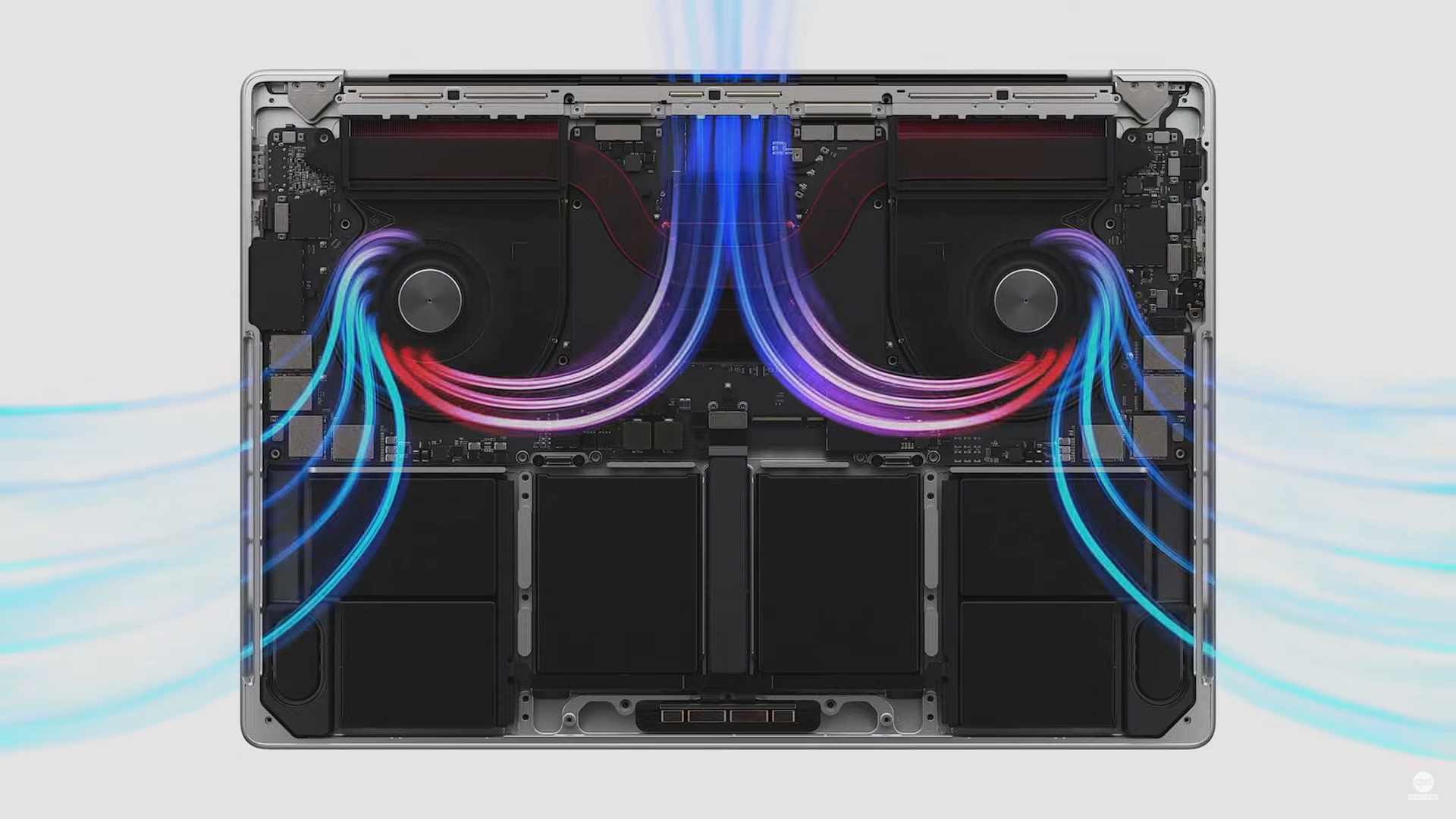 노트북에서 쿨링도 매우 중요한 요소죠. 2개의 팬을 탑재하고 좌우와 상단에 송풍구를 만들어서 쿨링을 담당합니다. 그와중에 언제나처럼 내부 디자인도 극단적으로 잘 정리해 놓은 애플 특유의 모습이 돋보이네요.