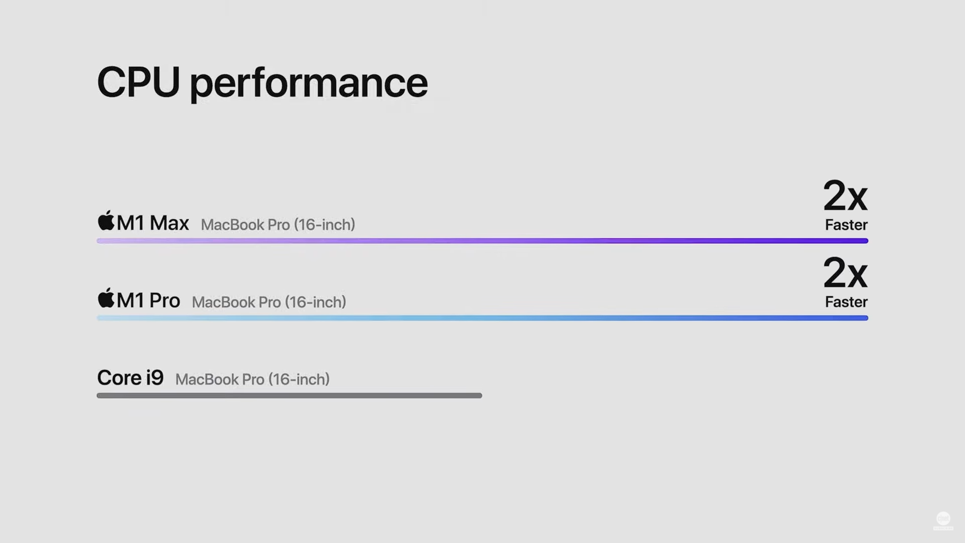 모든 수치는 애플에서 공개한 것으로, 향후 실제 벤치 결과에 따라서는 다소 차이가 있을 수 있습니다. 참고로 현재 유출된 벤치마크 결과에 따르면 M1 Max의 멀티 쓰레드 성능이 오리지널 M1 대비 55%까지 더 빠르다고 알려졌습니다. (출처: Apple M1 Max Benchmarks Leak Out, 55% Faster Than M1 CPU In Multi-Threaded Tests (wccftech.com) )