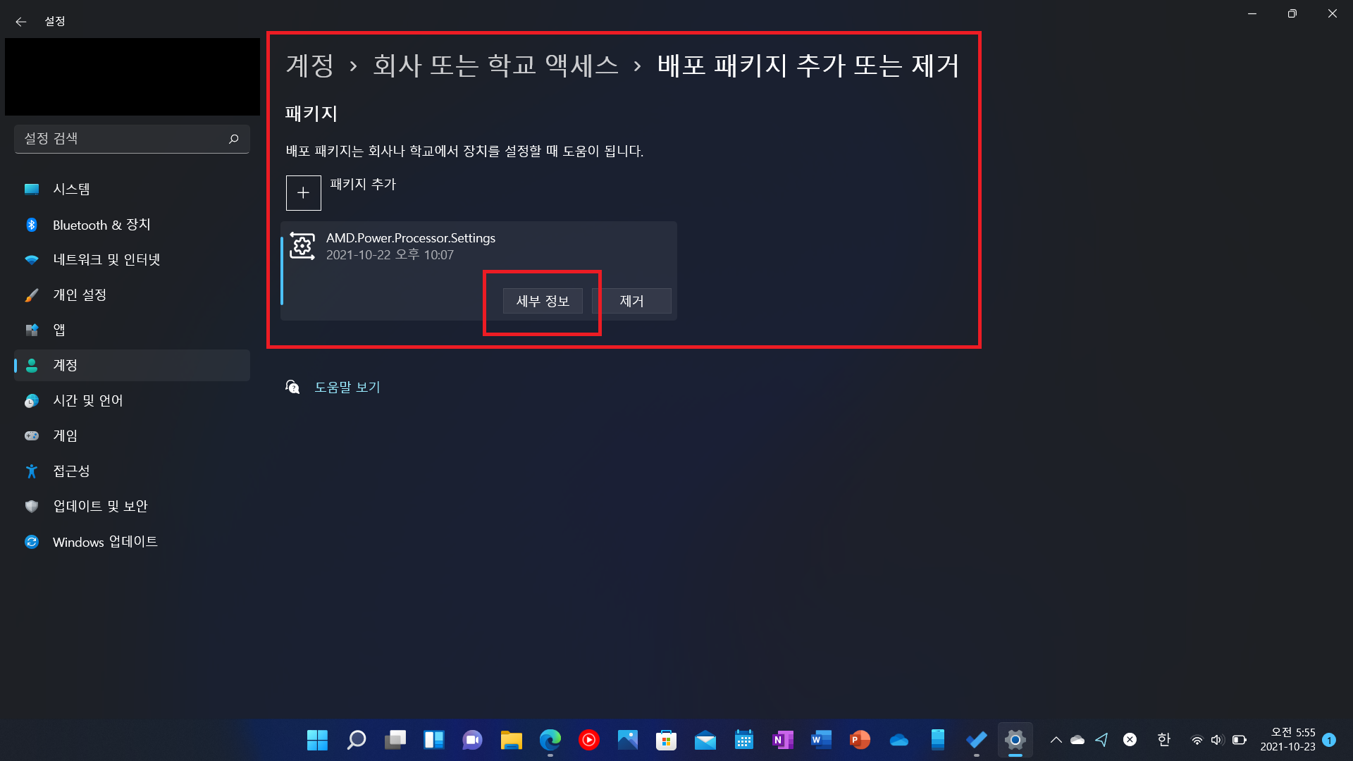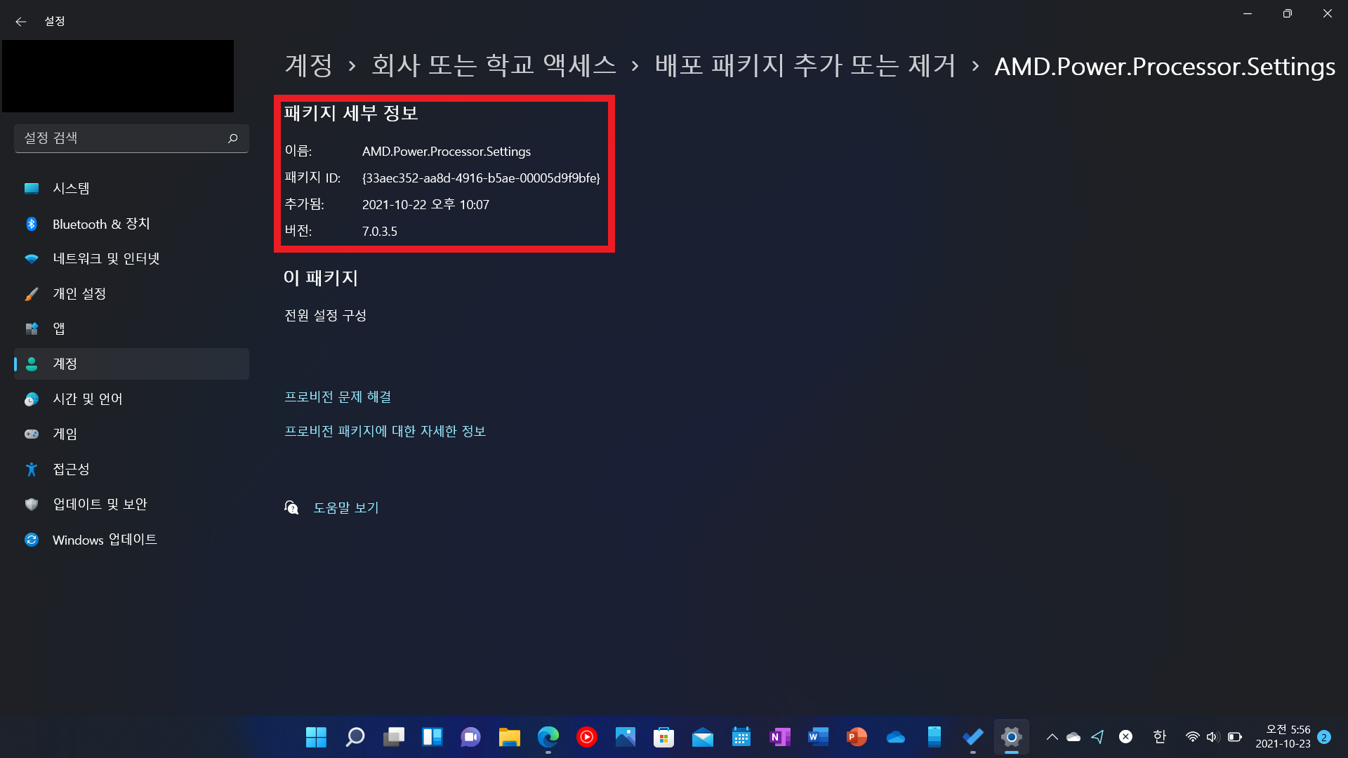 윈도우 업데이트와 칩셋 드라이버 설치가 정상적으로 이루어졌는지 확인하는 방법도 있습니다. 시작메뉴에서 톱니바퀴 아이콘을 눌러서 '설정'으로 갑니다. [설정] - 왼쪽 위의 계정 이름 클릭 - [회사 또는 학교 액세스] - [배포 패키지 추가 또는 제거] 로 이동합니다.