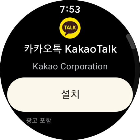 현재 갤럭시 워치용 카카오톡은 워치에서 스토어 검색을 하면 바로 나오고 이렇게 '설치' 라고 뜹니다. 설치 용량도 아주 적어서 금방 진행이 됩니다.