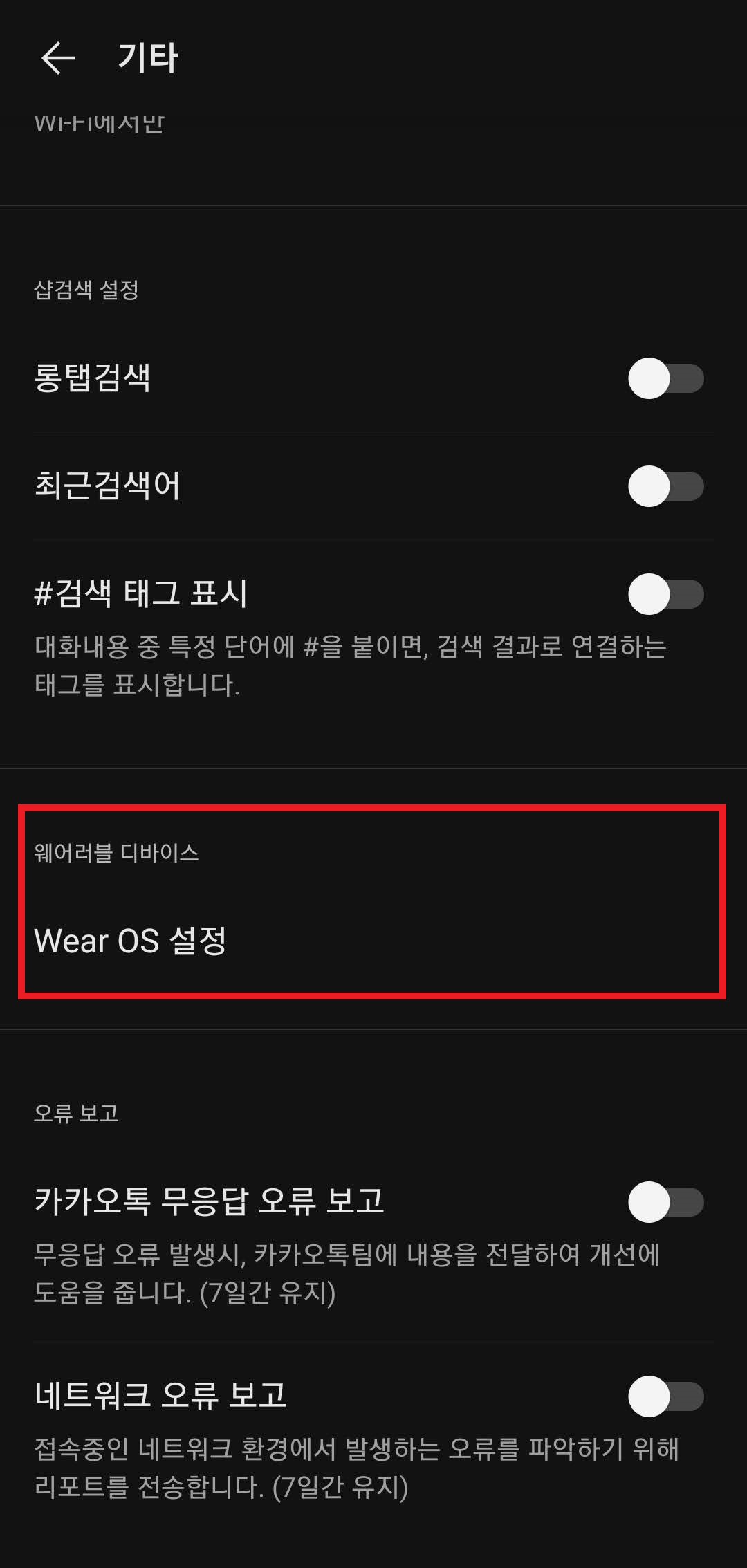 카카오톡 내에서 설정에 보시면 '기타' 안에 WearOS 설정이라고 있습니다. 여기에서 활성화를 해주어야 워치용 카카오톡도 정상적으로 동작합니다. 그런데 문제는.....