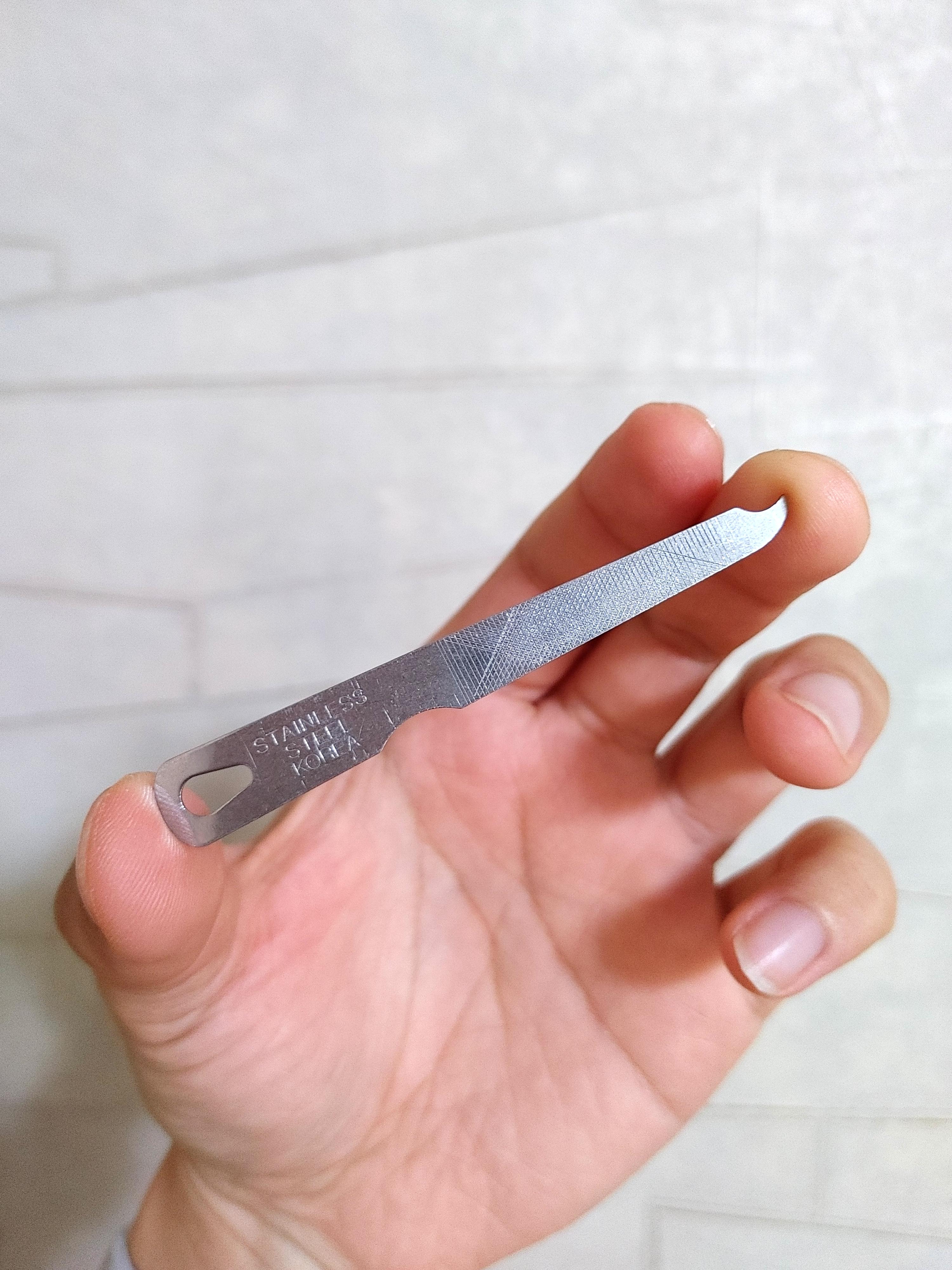 줄의 뾰족한 부분 말고 아래쪽 뭉툭한 부분을 안경 닦는 천으로 감싸고 스마트 태그의 하단 틈새에 살살 밀어 넣습니다. 그리고 좌우로 천천히 비틀어서 돌리면 따닥! 소리와 함께 입구가 열리고 조금 더 힘을줘서 조심스럽게 나머지 부분을 열면 이렇게 상처 나거나 플라스틱이 뭉개지는 부분 없이 깨끗하게 열리는 걸 확인하실 수 있습니다. 간단하죠?! 😀