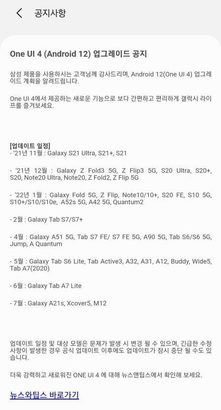 향후 일정이 변경될 수 있습니다만, 현재까지 알려진 바에 따르면 S21 시리즈는 이번 달인 11월, 폴드3와 플립3, 폴드2와 플립2 및 S20 시리즈는 다음 달인 12월, 그리고 폴드 1세대와 플립 1세대, S10시리즈와 S20FE 등은 내년 1월 업데이트가 예정되어 있다고 합니다. 탭의 경우 S7과 S7+ 모델이 내년 2월, S7FE모델이 4월로 예정되어 있습니다.