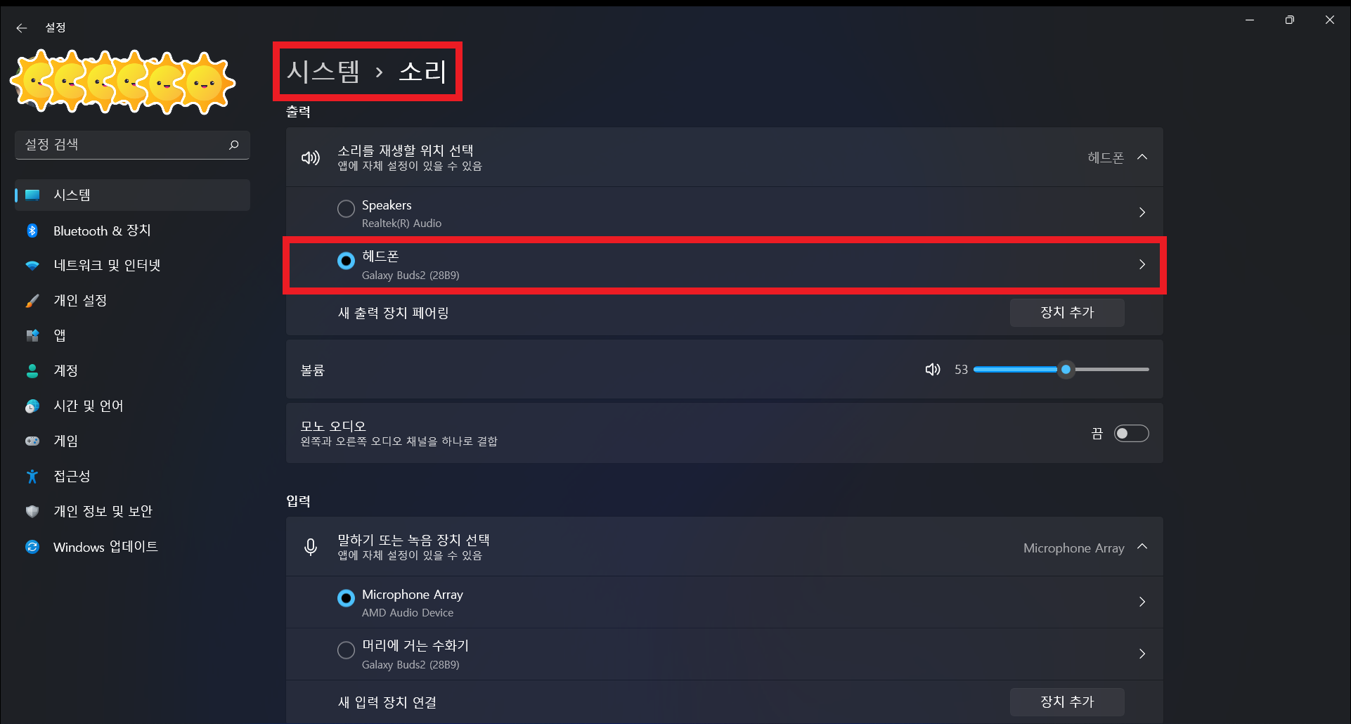 여기에서 '출력' 부분에서 '헤드폰' 부분에 연결된 기기가 보일 겁니다. 오른쪽의 화살표 아이콘을 눌러 봅니다! (참고로 하단의 '입력' 부분에서도 마이크를 블루투스 이어폰으로 바꿀 수 있습니다. 다만 '헤드셋'의 번역이 '머리에 거는 수화기'라고 되어 있네요 ㅎㅎ;; 이 부분은 수정이 필요해 보입니다)