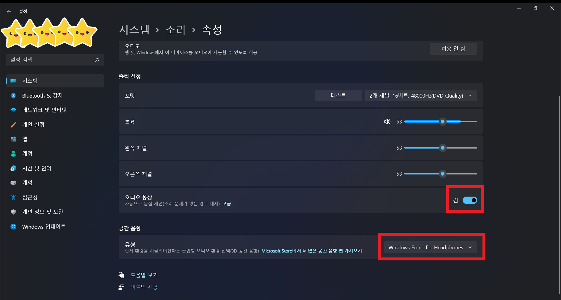 이렇게 속성으로 들어가서 보면 '오디오 향상' 부분이 있는데 이걸 켜주고, 하단의 '공간 음향' 부분을 'Windows Sonic for Headphones'를 선택해 줍니다. 이건 마치 돌비 애트모스나 DTS처럼 음향 효과를 더해주는 기능인데, 무선 이어폰에서도 사용이 가능하니까 활성화시켜주면 되는 겁니다. 참 간단하죠!?