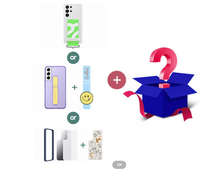 위의 사이트에 들어가서 보시면 직접 확인도 가능합니다만, 먼저 3만원으로 랜덤박스를 구입하는 방법이 하나 있습니다. 이 랜덤박스에는 스트랩형 실리콘 케이스, 스탠드로 사용할 수 있는 프로텍티브 케이스 (하드케이스)와 킥스탠드 혹은 프레임 커버와 커스텀 스킨 중에서 1개가 들어 있고, 여기에 추가로 갤럭시 워치4 클래식 46밀리 비스포크, 버즈 라이브, 버즈2, 갤럭시 핏2, 10000mAh 배터리팩, 15와트 무선 충전 솔로, 스마트 태그2개, 25W 충전기, 브랜드 콜라보 액세서리 1개 중 랜덤으로 1개가 들어갑니다.