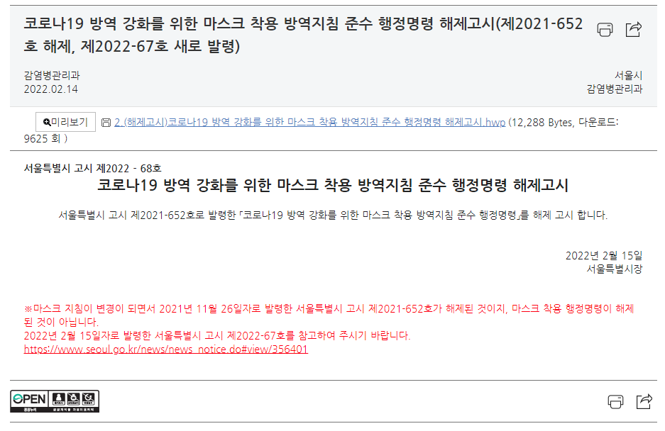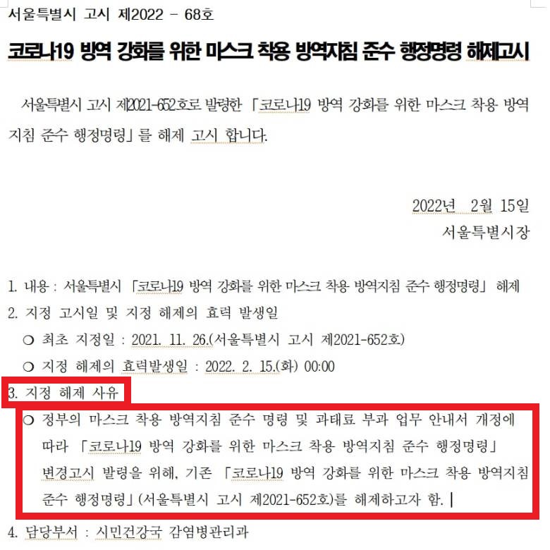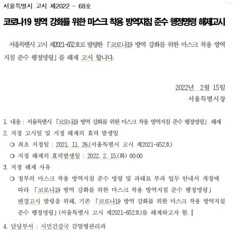 일단 '코로나19 방역 강화를 위한 마스크 착용 방역지침 준수 행정명령' 해제 자체는 사실입니다. 이는 2021년 11월 26일 서울특별시 고시 제2021-652호에 해당하는 것으로 2022년 2월 15일 00시00분부로 해제 되었습니다. 그런데 해제 사유를 봐야 합니다.