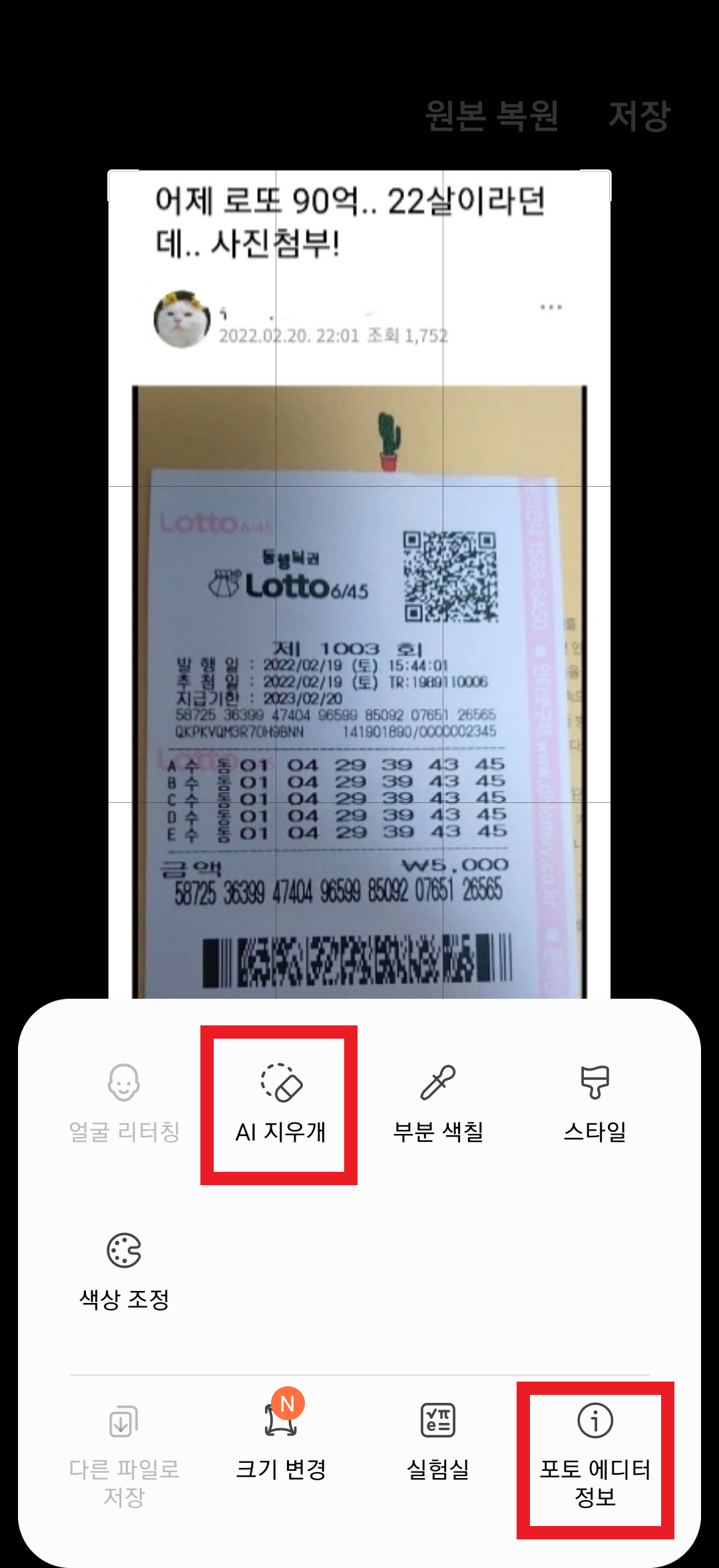 업데이트가 완료된 후에 편집하고자 하는 사진을 고르고 연필 아이콘을 누른 다음, 오른쪽 하단의 점3개 더보기 아이콘을 터치, 'AI 지우개' 부분을 누르면 이전과 달리 여기에 빛 반사 지우기와 그림자 지우기가 생겨나 있을 겁니다. 만약, 여기에 빛 반사 지우기와 그림자 지우기가 안 뜬다면 하단의 '포토 에디터 정보'를 터치하세요.
