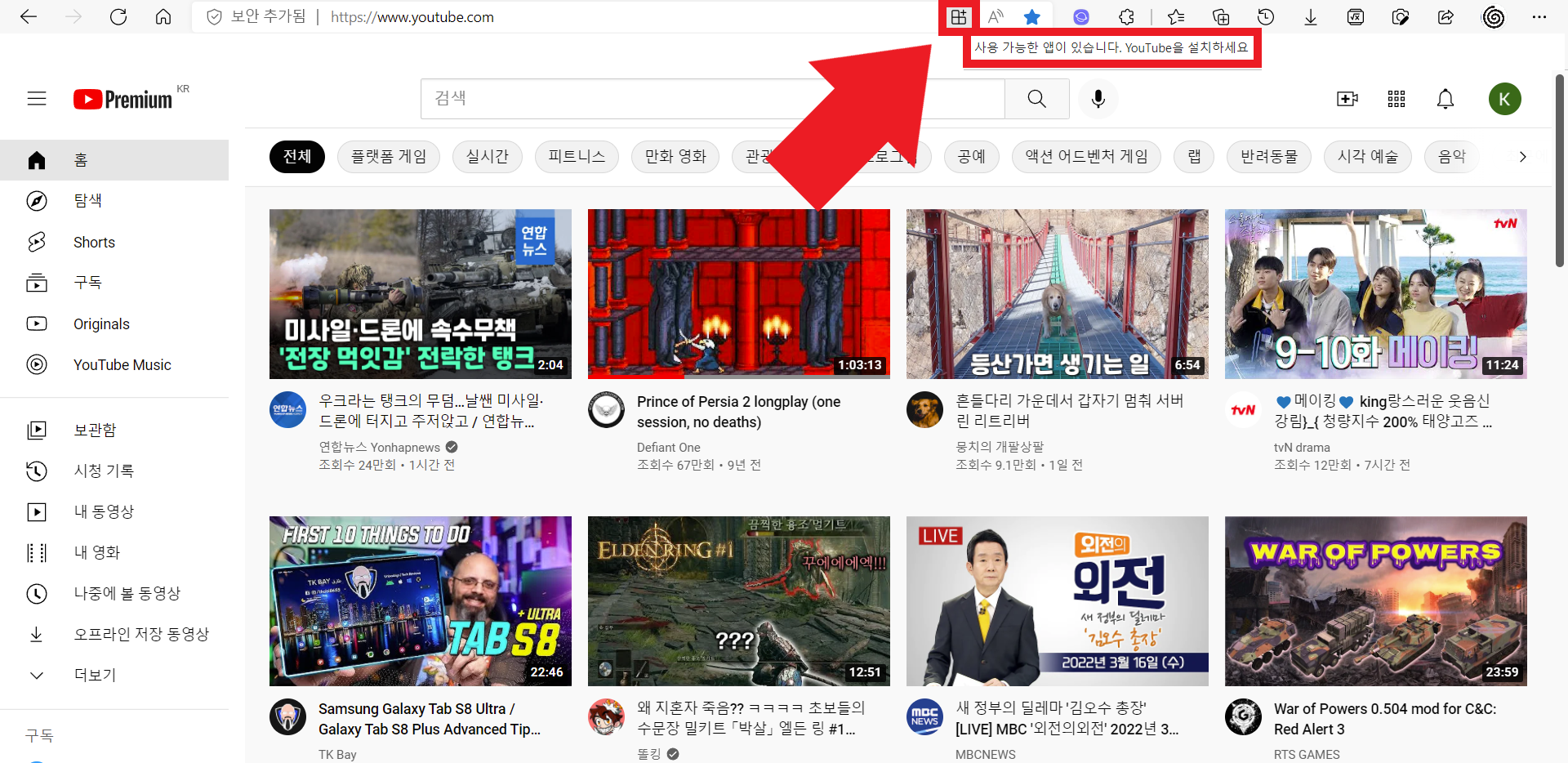 엣지나 크롬 브라우저에서 원드라이브에 접속하고 로그인을 하세요. 그리고 주소 표시줄의 오른쪽에 나타나는 앱 만들기 아이콘을 클릭합니다! 사실 이 방법은 꼭 원드라이브가 아니라도 가능한데, 유튜브를 예를 들어서 보여드리겠습니다.