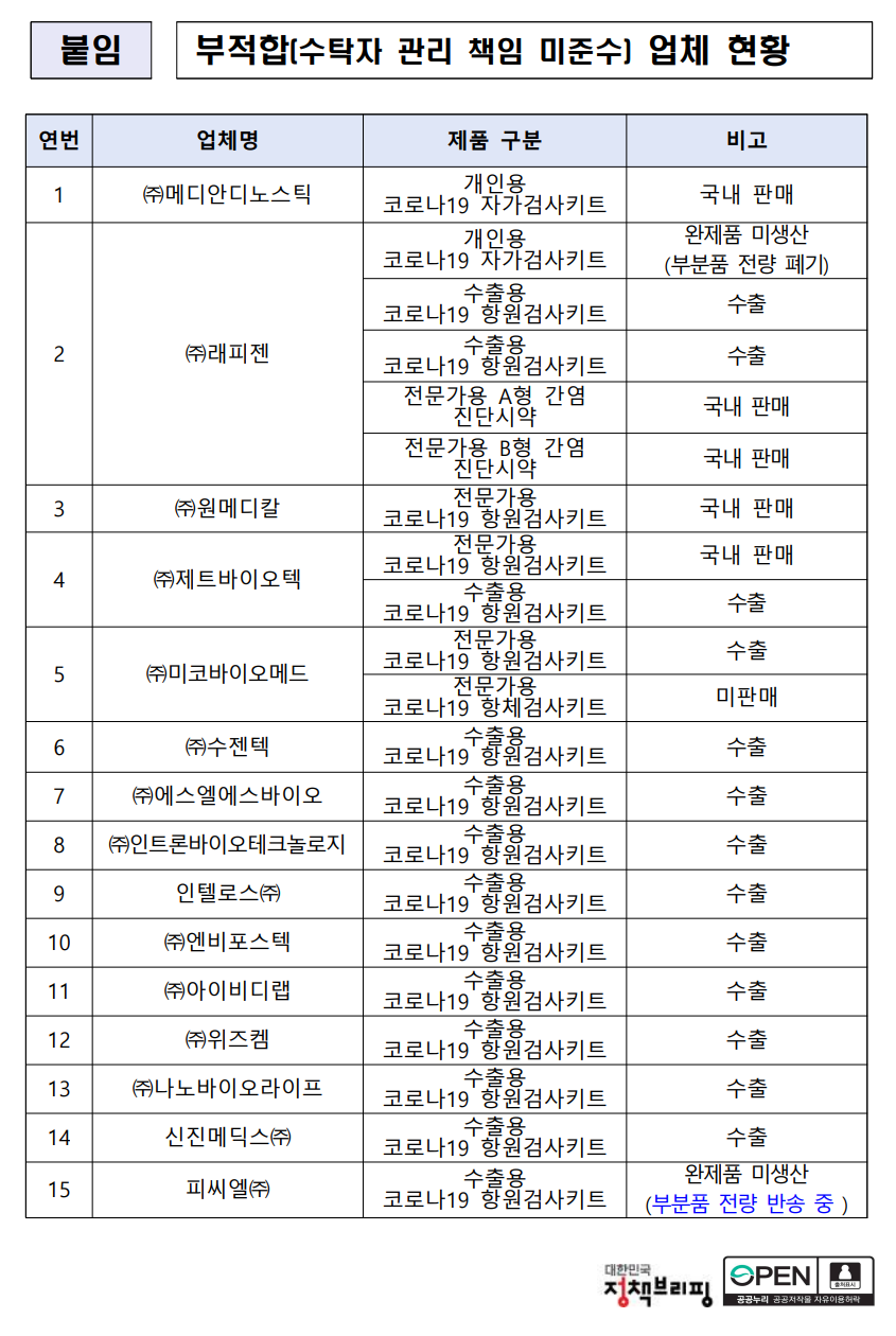 신속항원검사키트 등 부분품 위탁 제조업체 점검결과 발표 상세보기|보도자료 | 식품의약품안전처 (mfds.go.kr)
