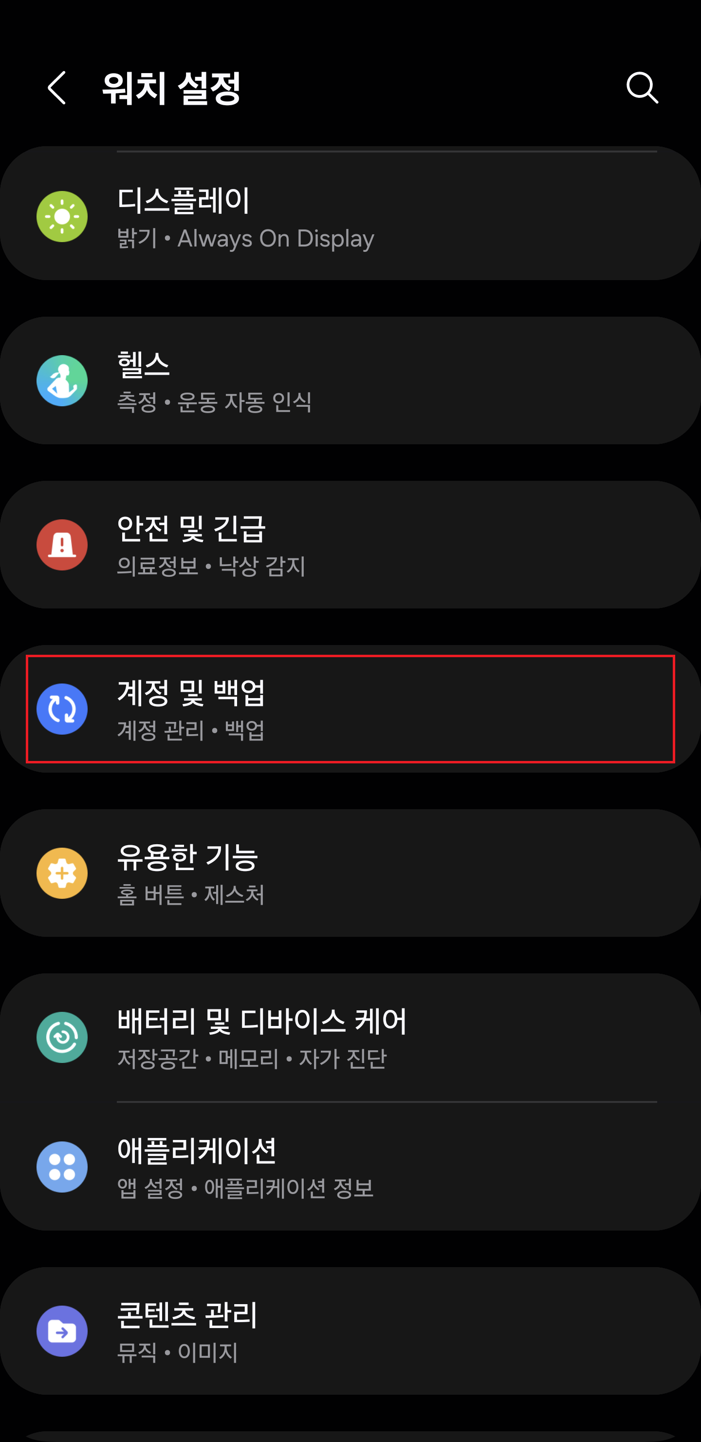 웨어러블 앱을 실행하면 위와 같은 화면을 보시게 될텐데요, 여기에서 [워치 설정] - [계정 및 백업] 으로 들어가 보세요. 그러면 삼성 계정과 구글 계정이 떠 있을 것이고, 이게 핸드폰에 Smart Switch 앱의 가동으로 백업이 되고 있다는 사실을 알 수 있습니다.