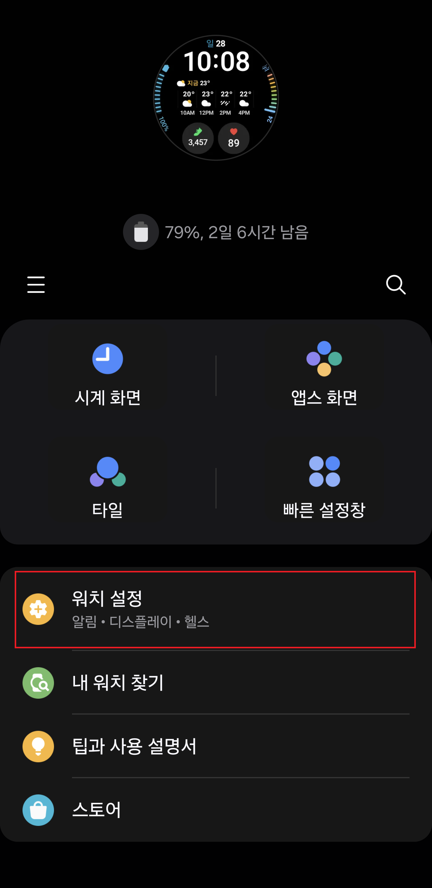 혹시 워치의 분실/도난시를 대비해서 잠금을 설정하고자 하시는 분들은 이렇게 해보세요. 워치 자체에서 [설정]으로 들어갑니다. 톱니바퀴 모양 아이콘이에요.