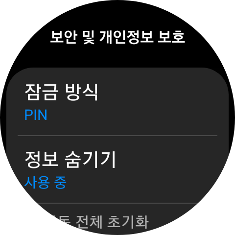 그리고 [보안 및 개인정보 보호]에서 [잠금 방식]을 선택해 보세요. PIN을 등록하면 워치를 풀어두거나, 워치를 껐다가 켜면, 혹은 초기화를 시도하면 반드시 비밀번호를 입력해야 합니다. 비밀번호를 분실하지 않도록 주의하는 것도 잊지 마시구요!