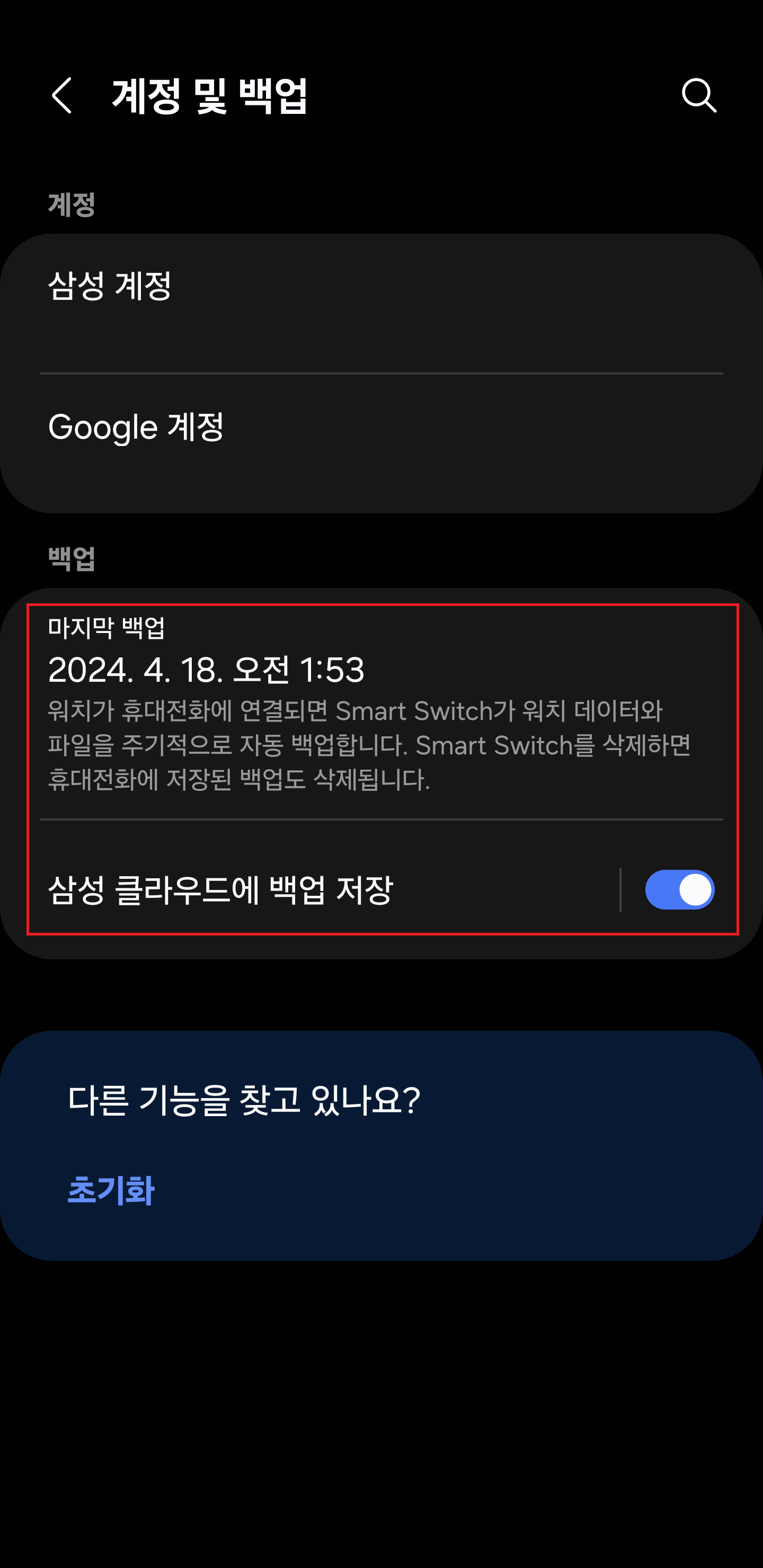 그리고 [삼성 클라우드에 백업 저장]을 누르면, 특정 조건이 충족되면 백업 데이터가 삼성 계정 기반의 클라우드에 저장되게끔 할 수도 있습니다.