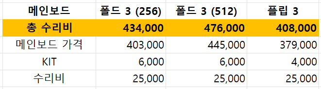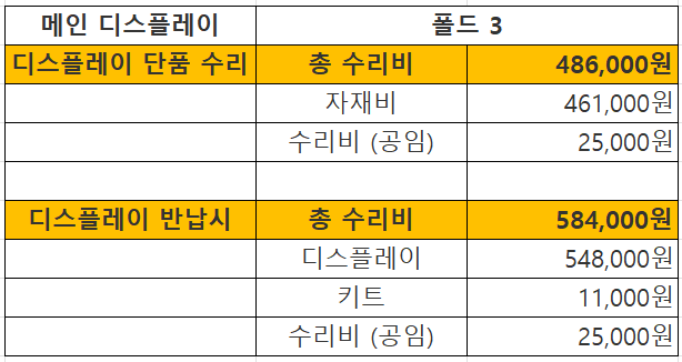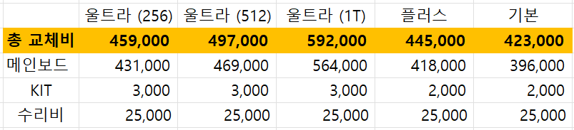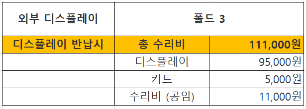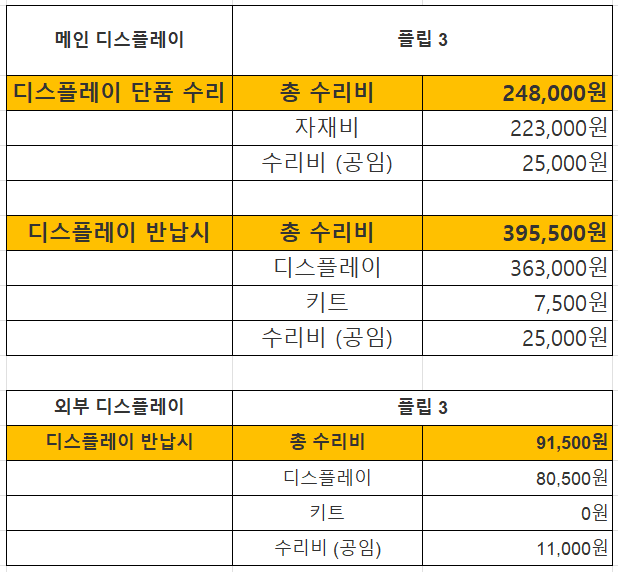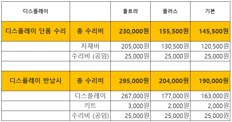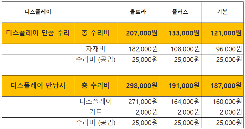참고로 모든 가격은 기존 부품 반납시 기준입니다. 예를 들어 디스플레이 교체를 해야 할 때, 기존 제품에 붙어 있던 파트를 반납하면 일부 할인을 해주는데, 그때를 기준으로 한다는 말입니다.