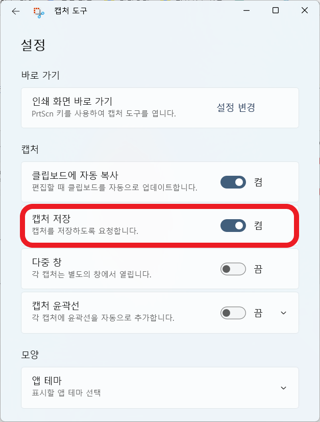 또 기본적으로 캡처 도구는 클립보드에 캡처 사진을 임시 저장하게 되고 이걸 그림판이나 원하는 프로그램에 붙여넣고 편집을 하면 됩니다만, 그냥 그 자체로 저장되도록 하고 싶으실 경우 설정을 살짝 바꿔주면 됩니다.