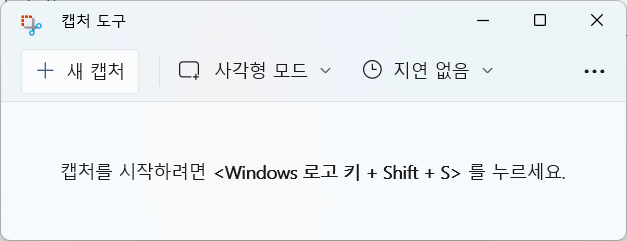 캡처 도구를 실행하면 요런 창이 뜹니다. 이제 이걸 보니 제가 어떻게 이걸 캡처 했는지 아시겠죠? 이 캡처 도구는 시작메뉴에서 찾아서 실행해도 되고, 설명처럼 Windows 로고 키 + Shift + S를 눌러도 됩니다.