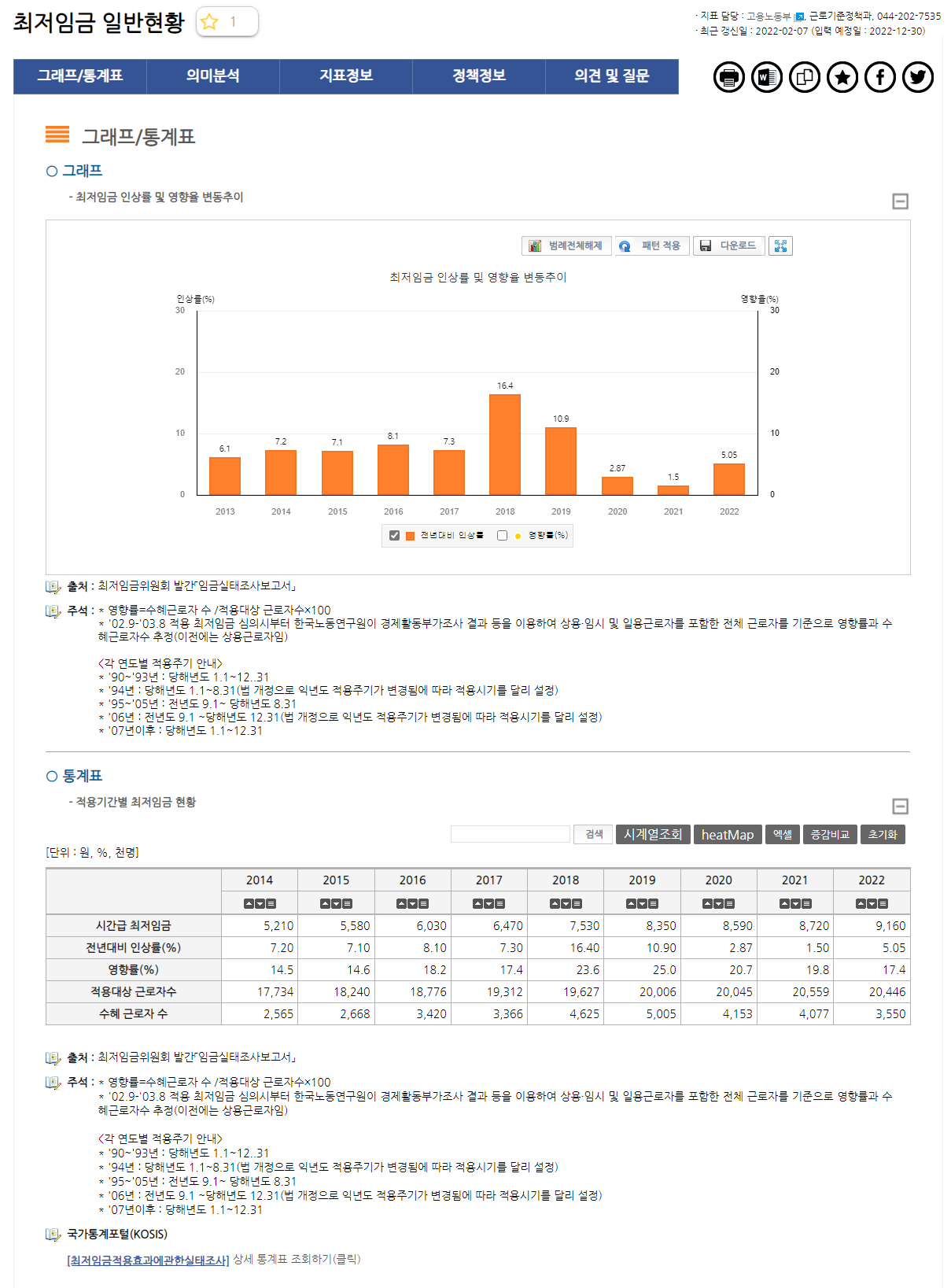 2014년을 예를 들면, 이때 최저임금은 시간 당 5,210원이고, 이게 전년 대비 7.2% 오른 수치라는 겁니다. 2018년에 들어서 최저임금이 크게 한번 올랐잖아요? 그래서 2017년에 6,470원이었던 시급이 2018년에 들어서는 7,530원이 되었고, 2017년 대비 16.4%가 오른 거였습니다.