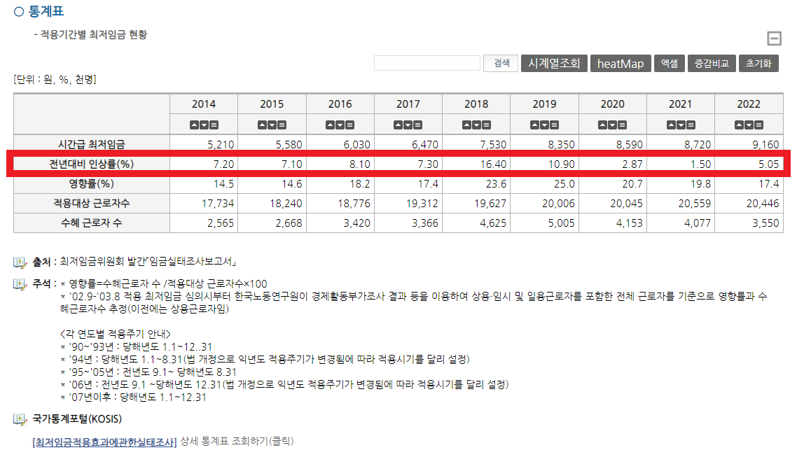 2014년에는 무려 시급이 5,210원이었네요 (.....) 저거 받고 어떻게 일했지 싶을 정도로 낮은데, 오늘은 이 이야기를 하려는 게 아니니 그건 접어두도록 하고요 😅 아래의 표를 보면 시간급 기준으로 최저임금이 나와있고, 그 아래에는 전년대비 인상률이 나와 있습니다.