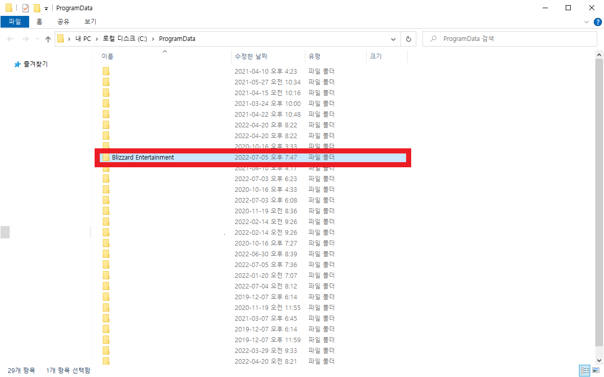 그리고 Blizzard Entertainment 라는 폴더를 선택하고 삭제합니다. 마우스 우클릭 후 삭제를 눌러도 되고 Delete키를 눌러도 되죠.