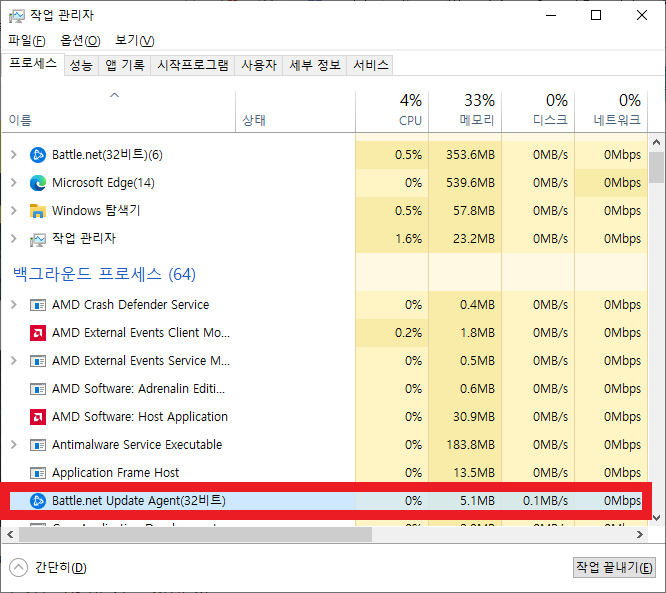 그럼 요런 화면이 뜰 텐데 '프로세스' 탭에 있는 Battle.net Update Agent를 선택하고, 오른쪽 하단의 '작업 끝내기'를 눌러서 해당 프로세스를 종료해 줍니다.