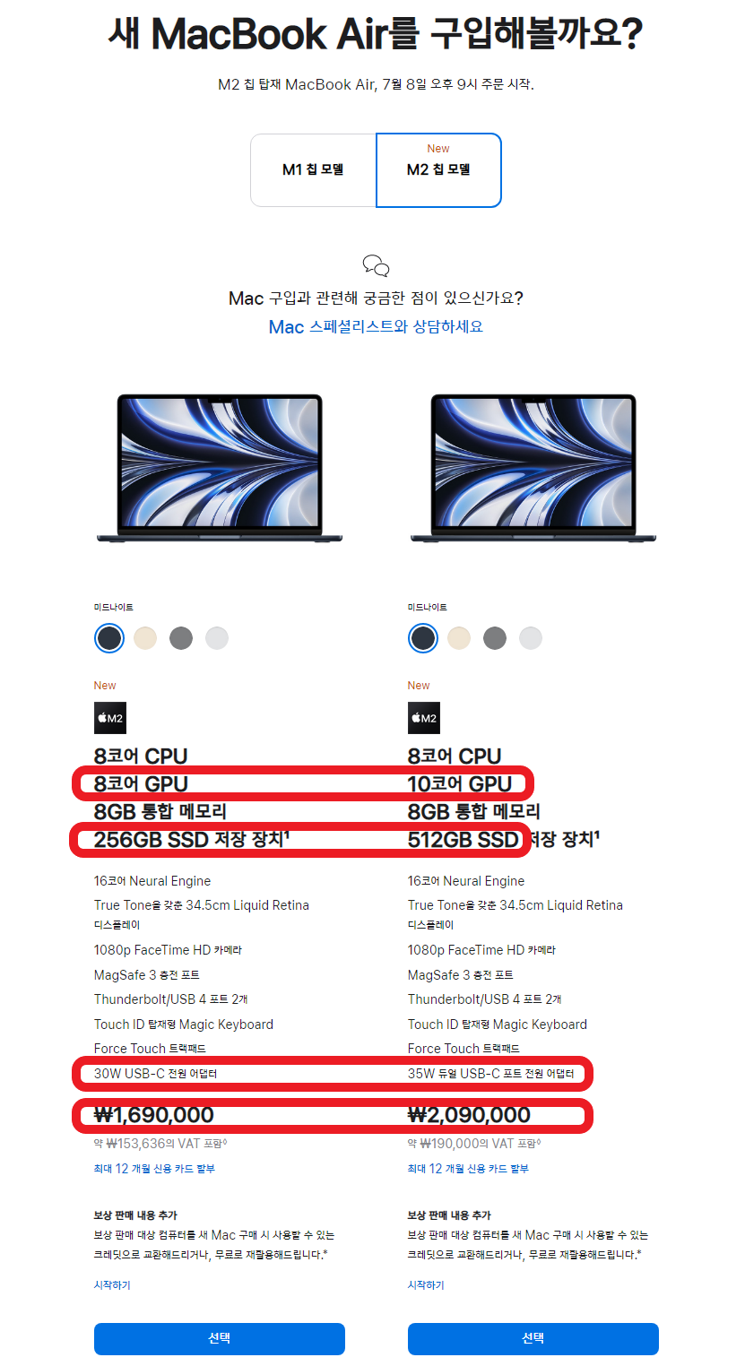 참고로 M2 맥북 에어는 크게 두 가지 모델로 나오는데 차이점을 간단히 보면 이렇습니다.
