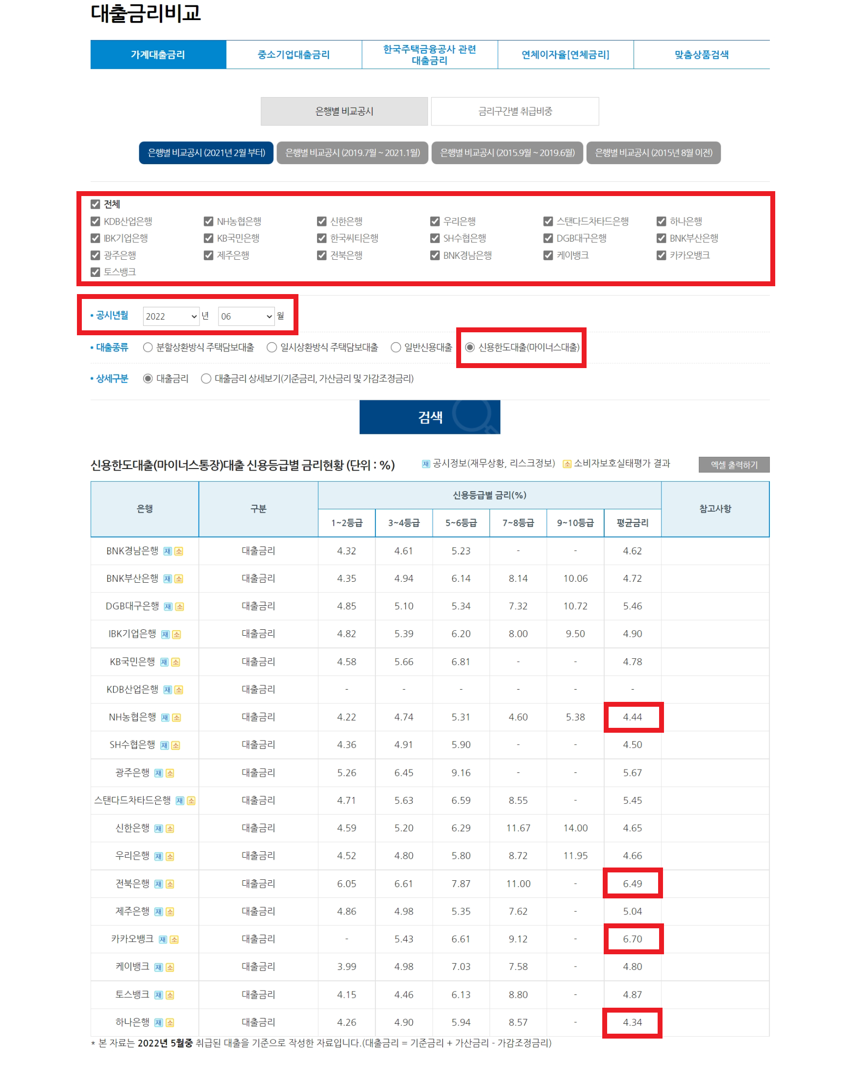 제가 올려드린 해당 페이지에 방문해 보시면 여러 조건 별 검색이 가능한데, 가장 최근의 마이너스 대출에 대한 대출금리를 선택하면 위와 같은 화면을 보실 수 있습니다. 당연히 신용 등급별 금리 차이가 있기는 합니다만, 평균 금리를 바탕으로 이야기를 해보자면, NH농협은행과 하나은행이 각각 4.44%, 4.34%로 가장 낮았고, 전북은행과 카카오뱅크가 각각 6.49%와 6.70%로 가장 높았습니다.