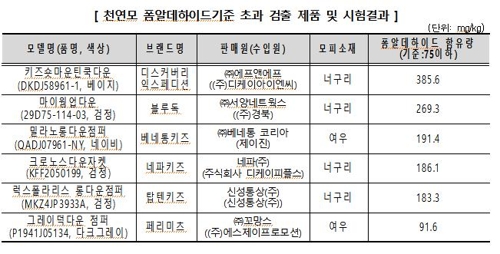 외피 기준 평균 459mg/kg 검출, 이게 어느 정도인지 감이 안 오잖아요? 그런데 일전에 아동용 겨울 점퍼에서 포름알데히드가 검출돼서 크게 문제가 됐던 적이 있습니다. 그 당시 검출 수치를 보면 다음과 같습니다.