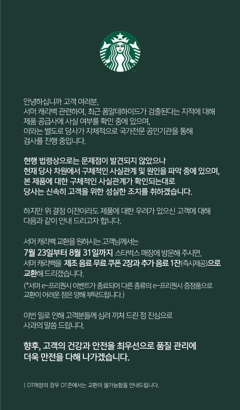 이와는 별도로 현재 소유하고 있는 서머 캐리백 이용에 불편을 느끼실 수 있는 고객님들을 위해, 캐리백을 지참해 매장을 방문시 무료 음료 쿠폰 3장으로 제공하는 현재의 교환 조치는 오는 8월 31일까지 변동없이 진행될 예정입니다.