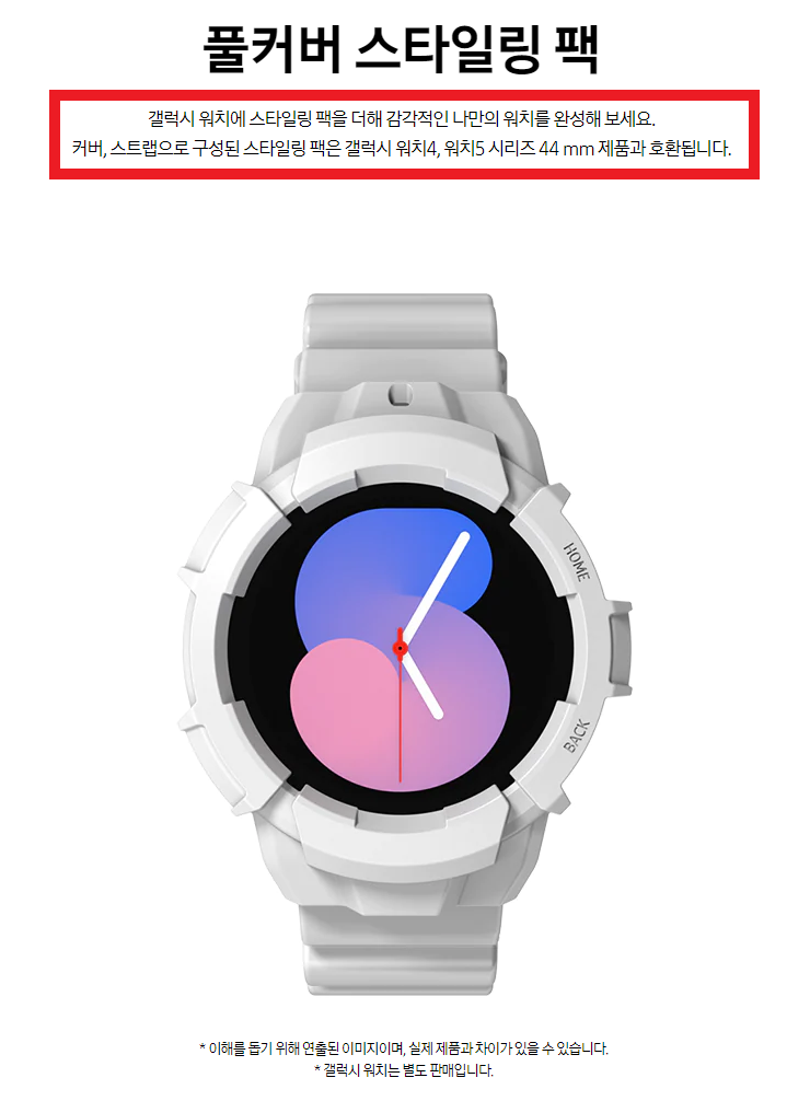 기존 갤럭시 워치4 에서도 사용이 가능하다고 합니다 😍😍😍 참고로 이 풀커버 스타일링팩은 40mm 제품과 44mm 제품 두 가지가 따로 나오기 때문에 사용하고 계시는 제품에 맞게 선택하셔야 합니다. 아쉽지만 갤럭시 워치4 클래식 제품에서는 크기 차이로 인해서 사용할 수 없습니다 😥