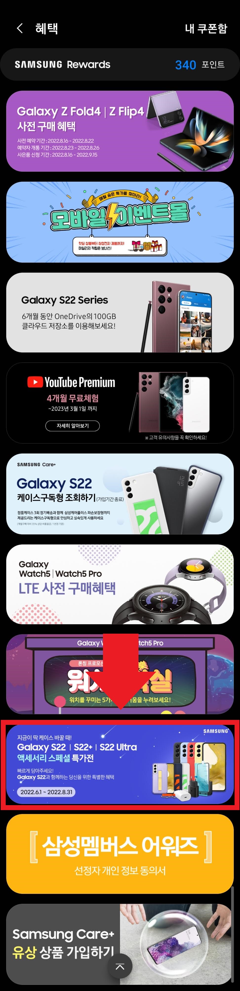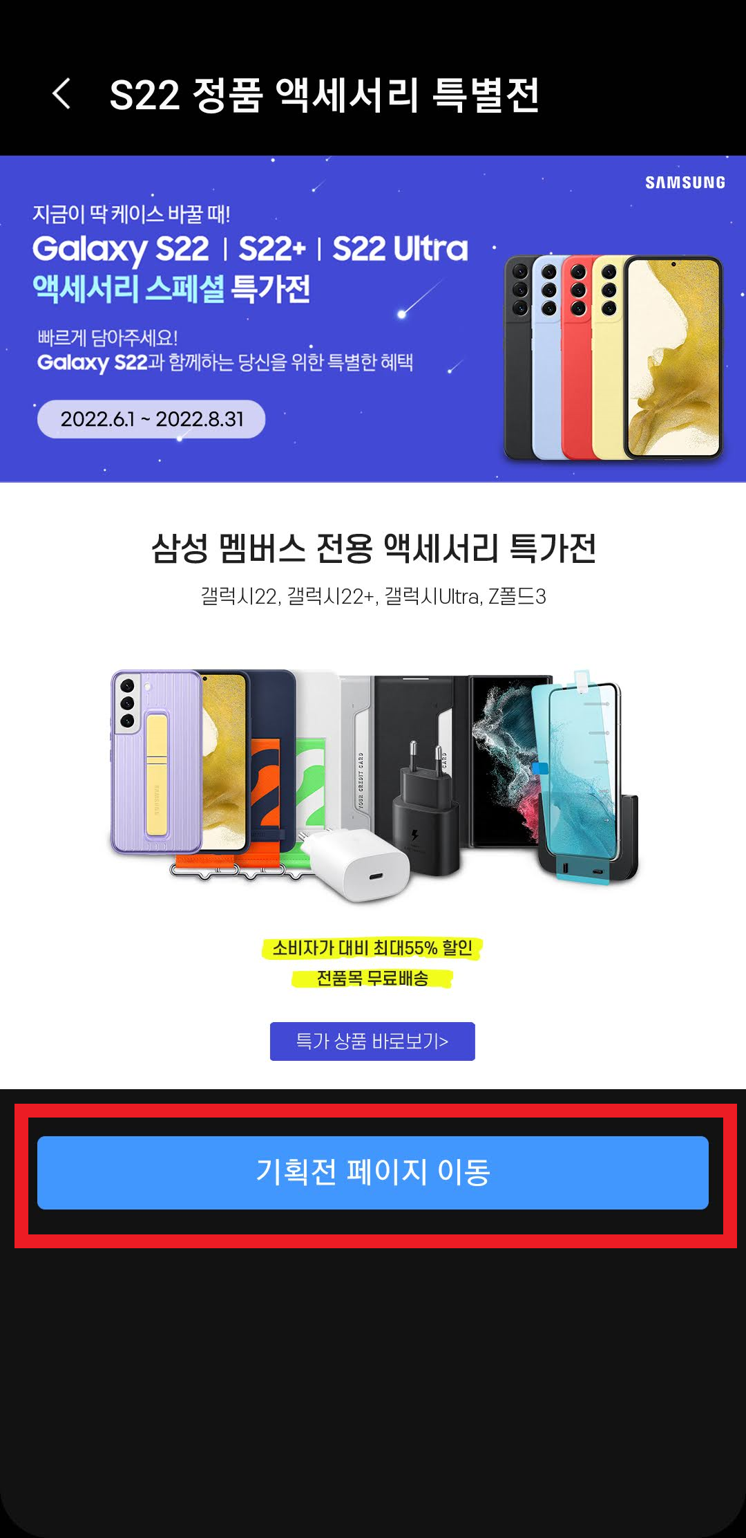 갤럭시 S22, S22 플러스, S22 울트라 액세서리 스페셜 특가전 이라는 배너가 보일 겁니다. 기간도 8월 31일까지라고 되어 있죠? 여기를 터치하고 들어갑니다.