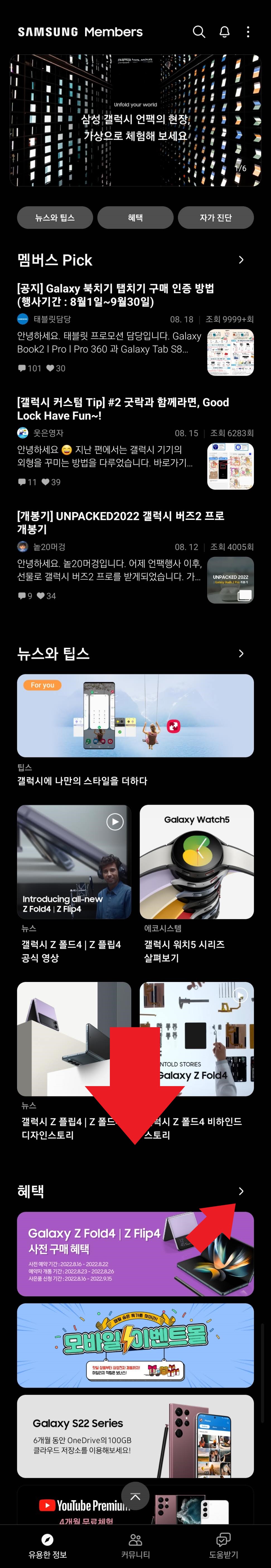 여러분이 사용 중이신 S22, S22 플러스 혹은 S22 울트라에서 'Samsung Members'라는 앱을 찾아보세요. 위와 같은 아이콘으로 되어 있습니다. 그리고 실행하면 아래와 같은 화면을 보실 수 있습니다.