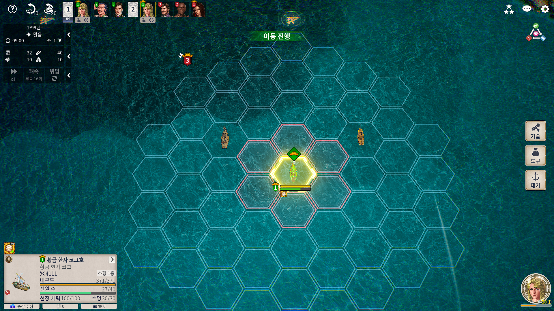 기본적으로 육각형 진형 위로 이동하고 적의 배에 충돌하여 데미지를 주거나 멀리서 포격을 가하거나 근접해서 백병전을 펼칠 수 있습니다. 캐릭터의 고유 기술을 사용할 수도 있구요. 그리고 전투 필드 상에도 회오리가 치고 있는 지역에서는 배의 내구도가 손상되는 등 여러 부가적인 요소들도 가미되어 있습니다.