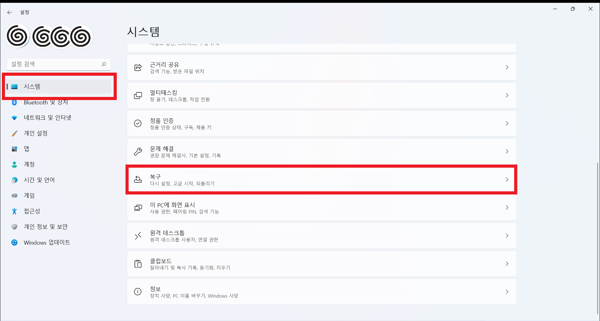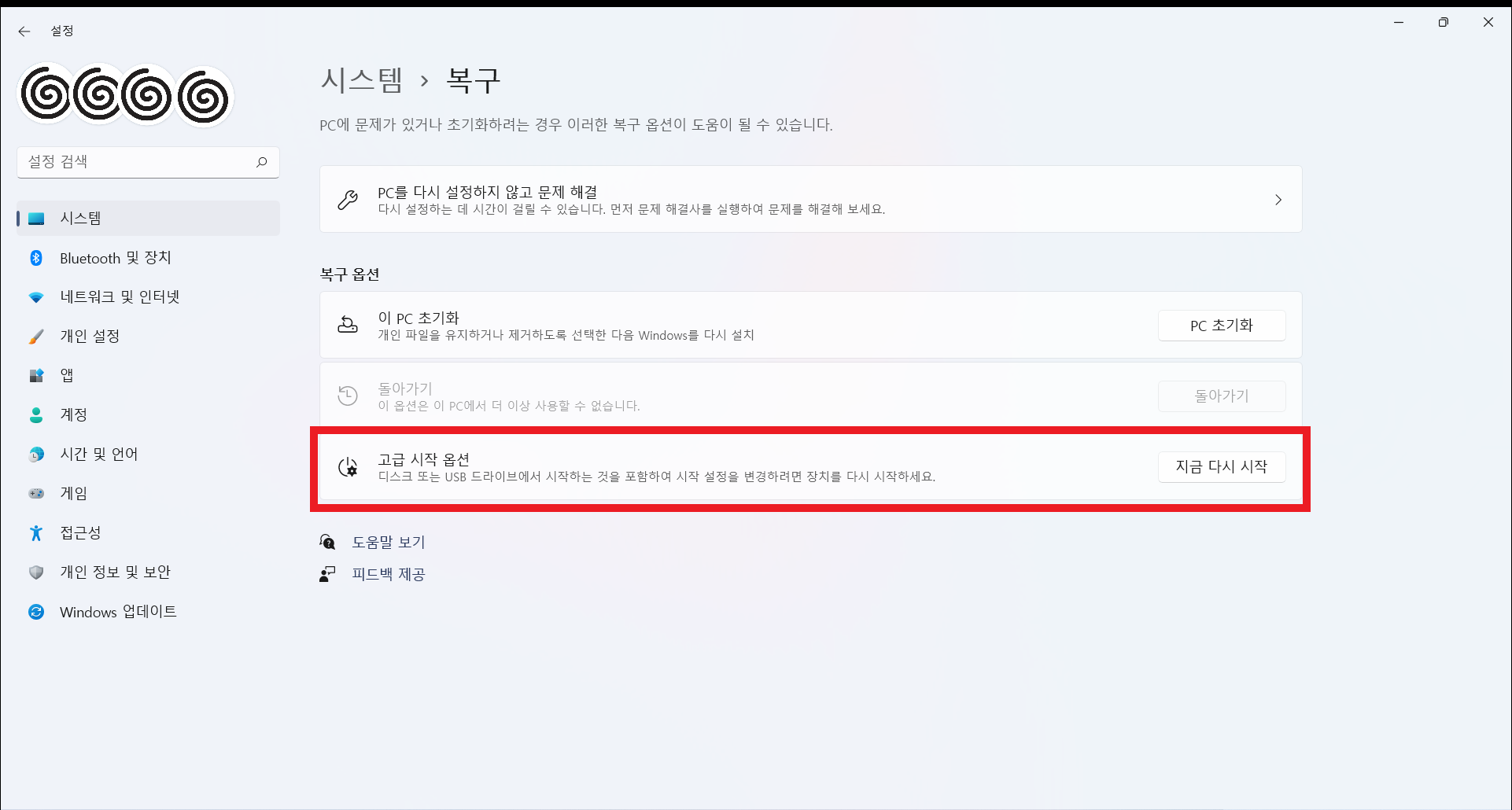 참고로 윈도우10은 설정에서 윈도우 업데이트 및 보안 - 복구 순으로 들어가면 있습니다.