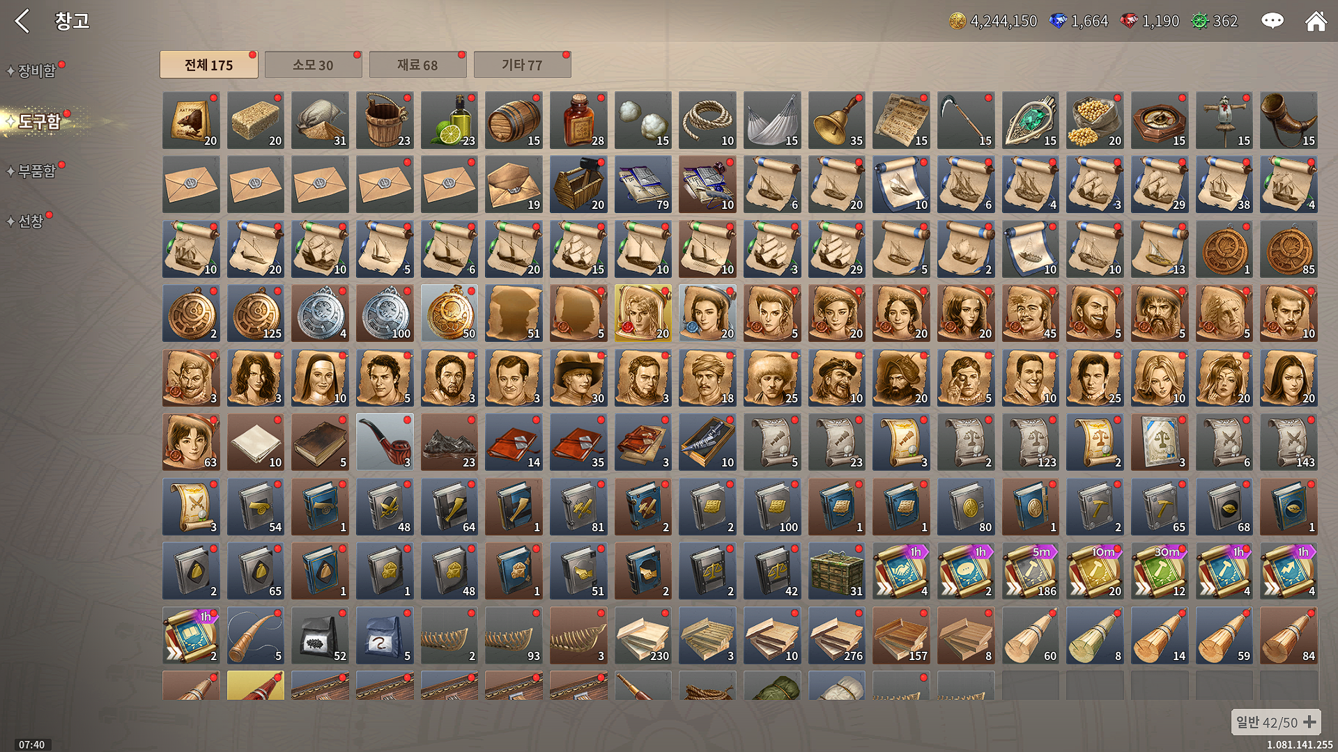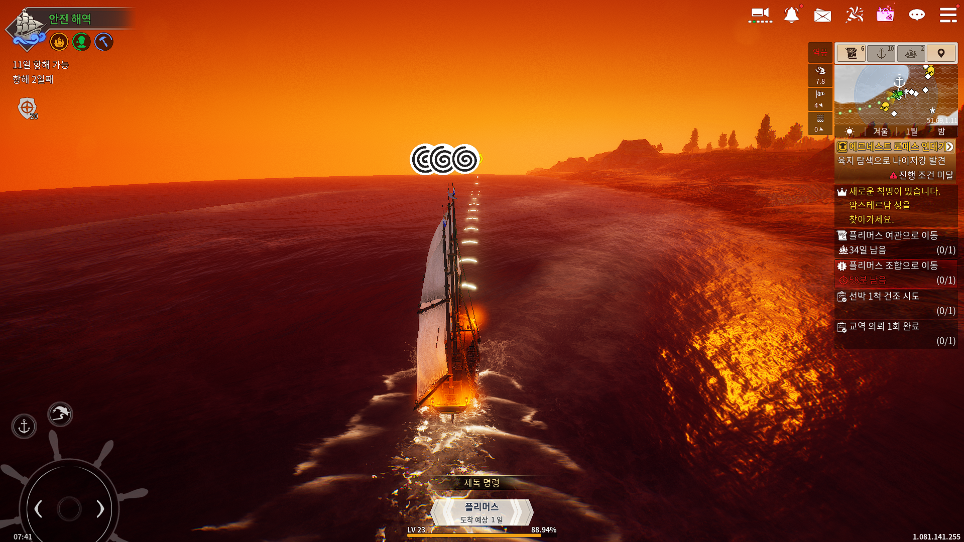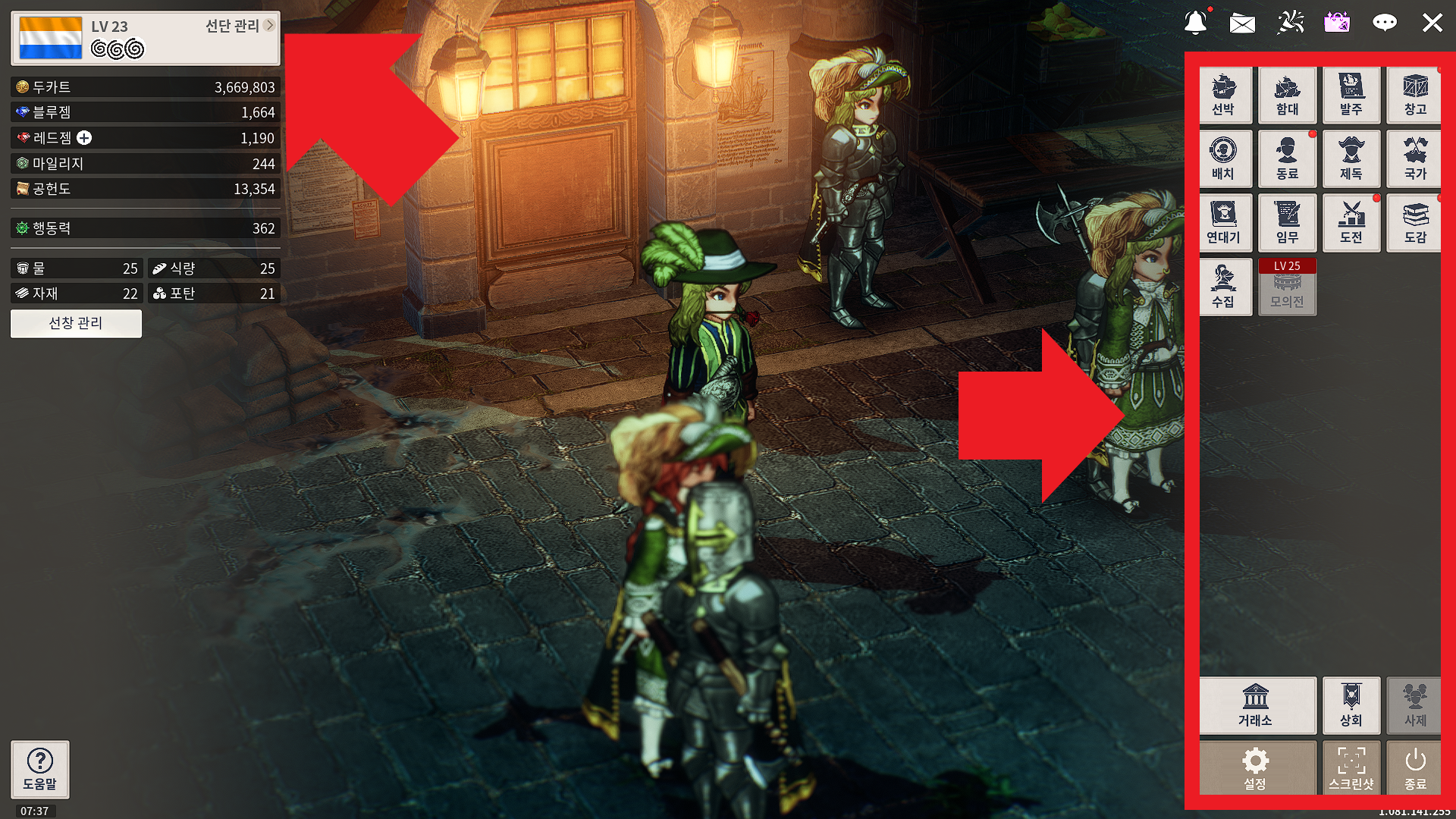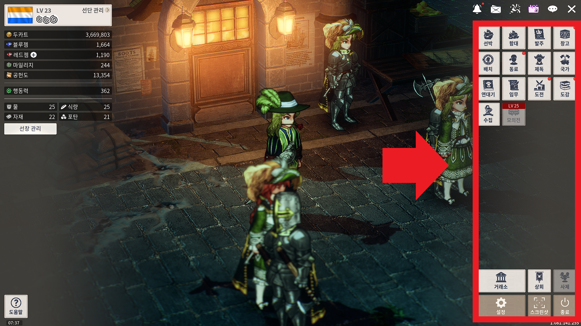 선박, 함대, 발주, 창고, 배치, 동료, 제독, 국가, 연대기, 이뭄, 도전, 도감, 수집, 거래소, 상회, 사제, 설정, 스크린샷, 종료.....봐야 할 게 뭐가 이렇게나 많은지 정신이 하나도 없습니다.