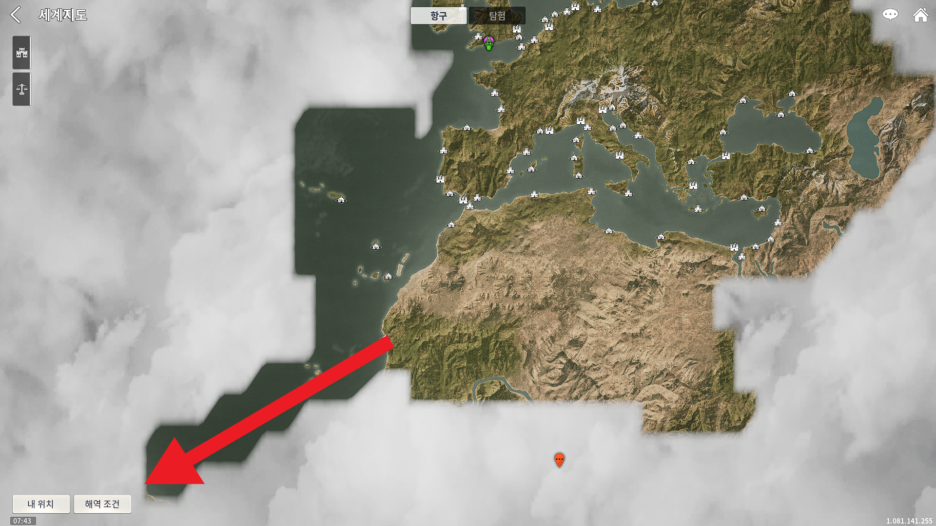 해당 제한사항이 저 드넓은 바다 가운데에 그 어디에도 없고, 아메리카 대륙에 도착하면 그 대륙 바로 앞에 결계가 쳐져 있고 여기를 통과하려고 하면 배 스펙이 낮아서 진입 안 된다고 나옵니다. 결국 시도했다가 못 돌아오고 죽고 게임 끝 할 수 있다는 소리죠. 저도 겨우겨우 다시 돌아왔거든요.