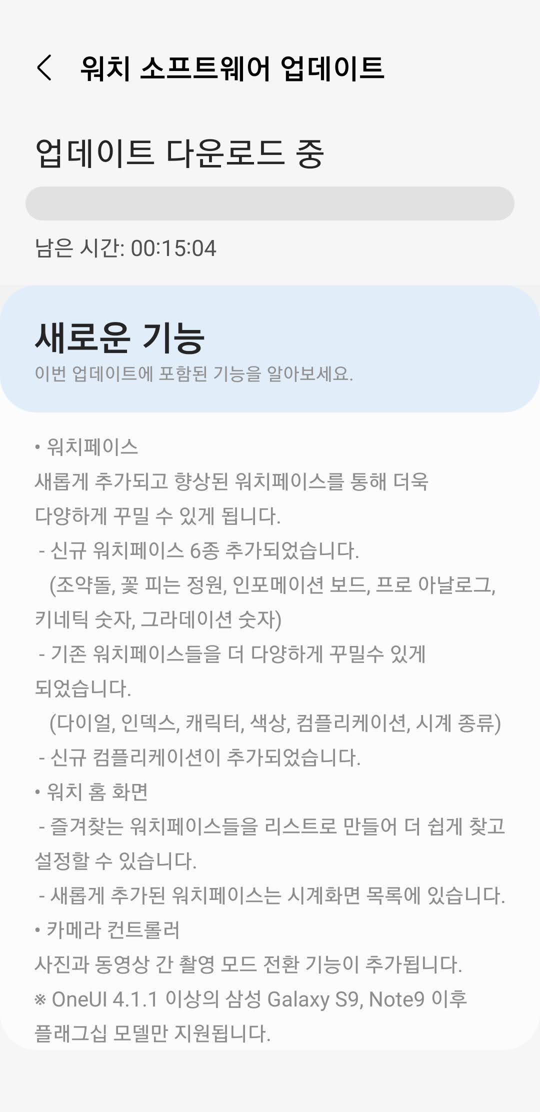 갤럭시 워치5 시리즈에 들어간 소프트웨어와 동일하고 신규 워치페이스와 동작 안정화, 최적화 등이 많이 이루어진 버전이고, 설치 용량도 무려 900메가에 달할 정도로 대규모 업그레이드입니다. 미리미리 준비하셔야겠죠?