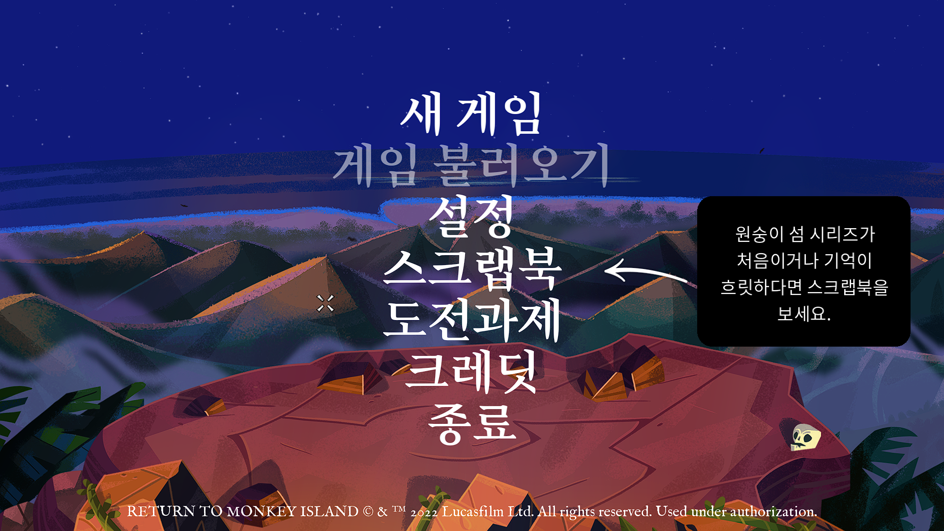 원숭이 섬으로의 귀환은 완전히 새롭지만 동시에 완전히 친숙한 게임입니다. 무슨 말이냐구요? 새로운 작품으로 새로운 이야기를 하니까 완전히 새롭습니다. 그런데 게임의 배경과 캐릭터, 음성, 배경 음악 등이 기존 플레이어들에게 친숙한 바로 그것들이라 완전히 친숙합니다. 요기 타이틀만 봐도 바로 친근함이 느껴지잖아요?