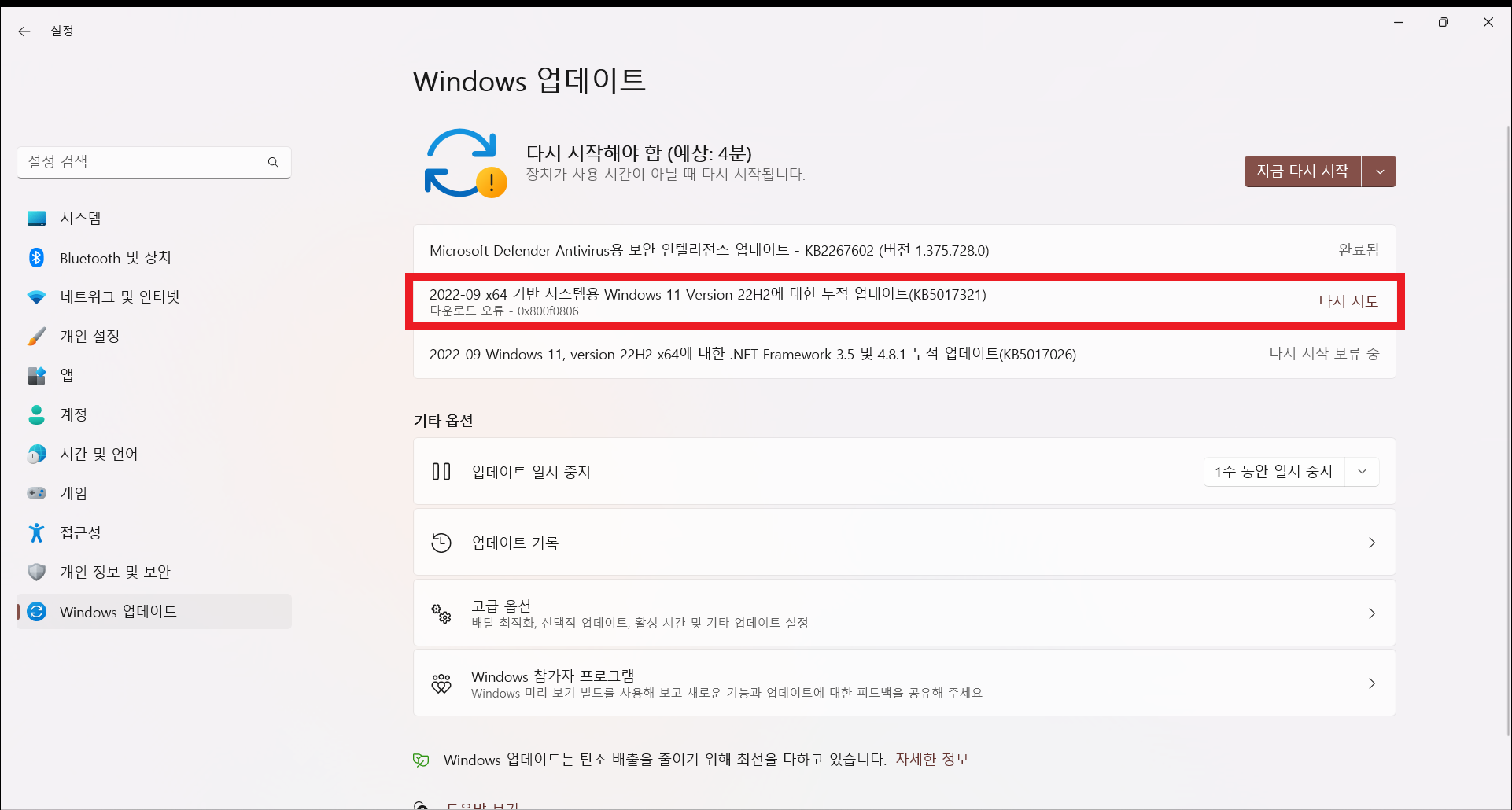 Windows 업데이트의 경우에도 문제가 있을 경우 바로 다시 시도할 수 있는 버튼이 생겼고 다운로드 오류도 바로 볼 수 있게 일부 수정 되었습니다.