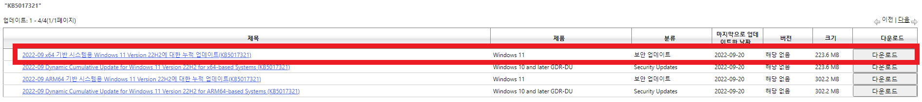 오른쪽 끝의 '다운로드'를 누르시면 파일 하나가 다운로드 될 텐데, 이걸 더블클릭하면 업데이트가 수동으로 설치됩니다. 설치 후 재부팅하면, 해당 업데이트 설치가 완료됩니다. 간단하죠?