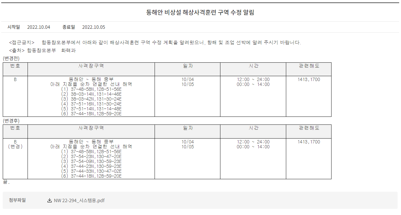 그나마 다행인 건 국립해양조사원 등에서는 이 일대가 비상설 해상사격훈련구역으로 되어 있어서 언제든 훈련상황이 일어날 수 있다는 것입니다만