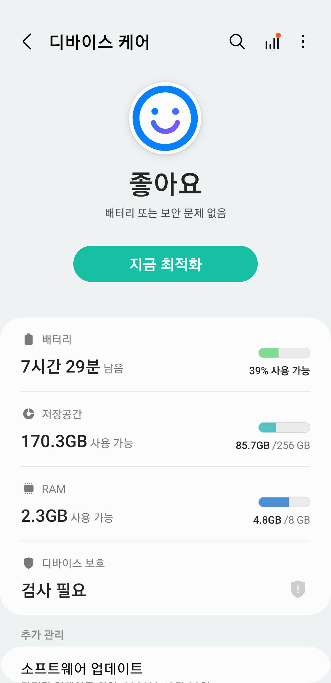설정에서 [배터리 및 디바이스 케어] - [디바이스 보호]로 가보시면 검사를 할 수 있는 메뉴가 있습니다. 이걸 통해서 핸드폰 자체에 어떤 보안 위협이 있는지 확인해 볼 수 있습니다. 또 자동 검사를 걸어둘 수도 있으니 반드시 사용하는 게 좋겠죠?