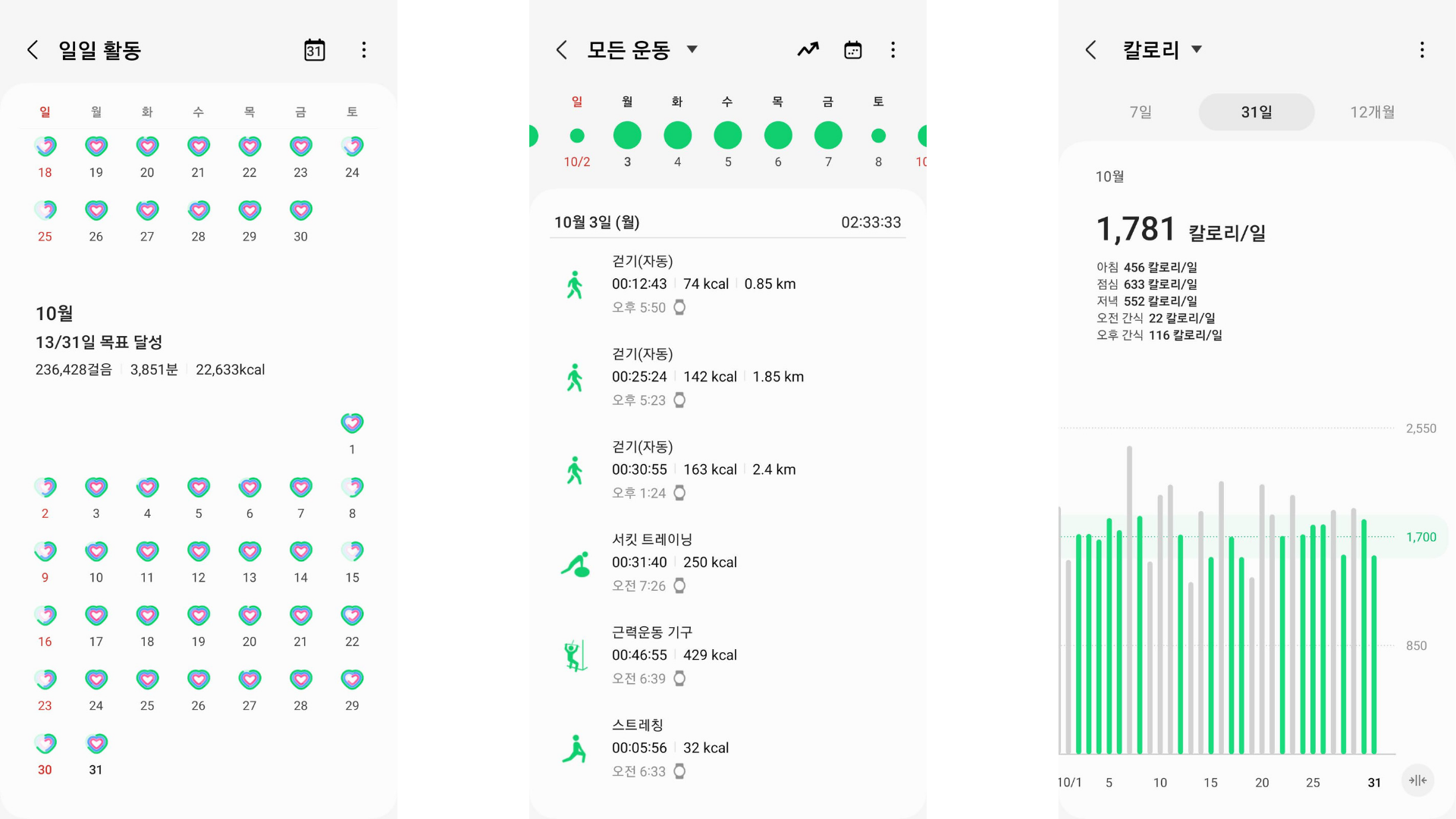 저는 2021년 2월 갤럭시핏2를 사용하기 시작하면서 삼성헬스에 데이터를 저장했고, 이후 갤럭시 워치 액티브2 그리고 지금 갤럭시 워치4로 이어서 계속 오는 중입니다. 그때부터 지금까지 주말 제외 매일 일정한 루틴으로 운동을 해오고 있습니다.