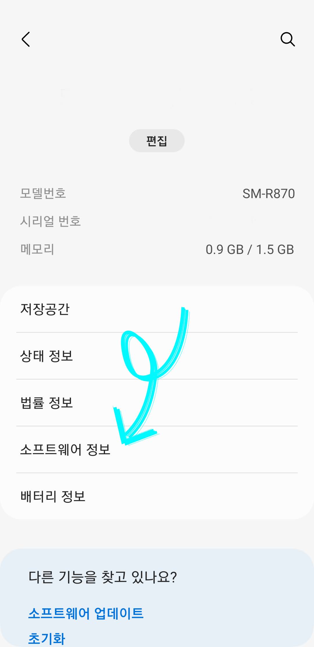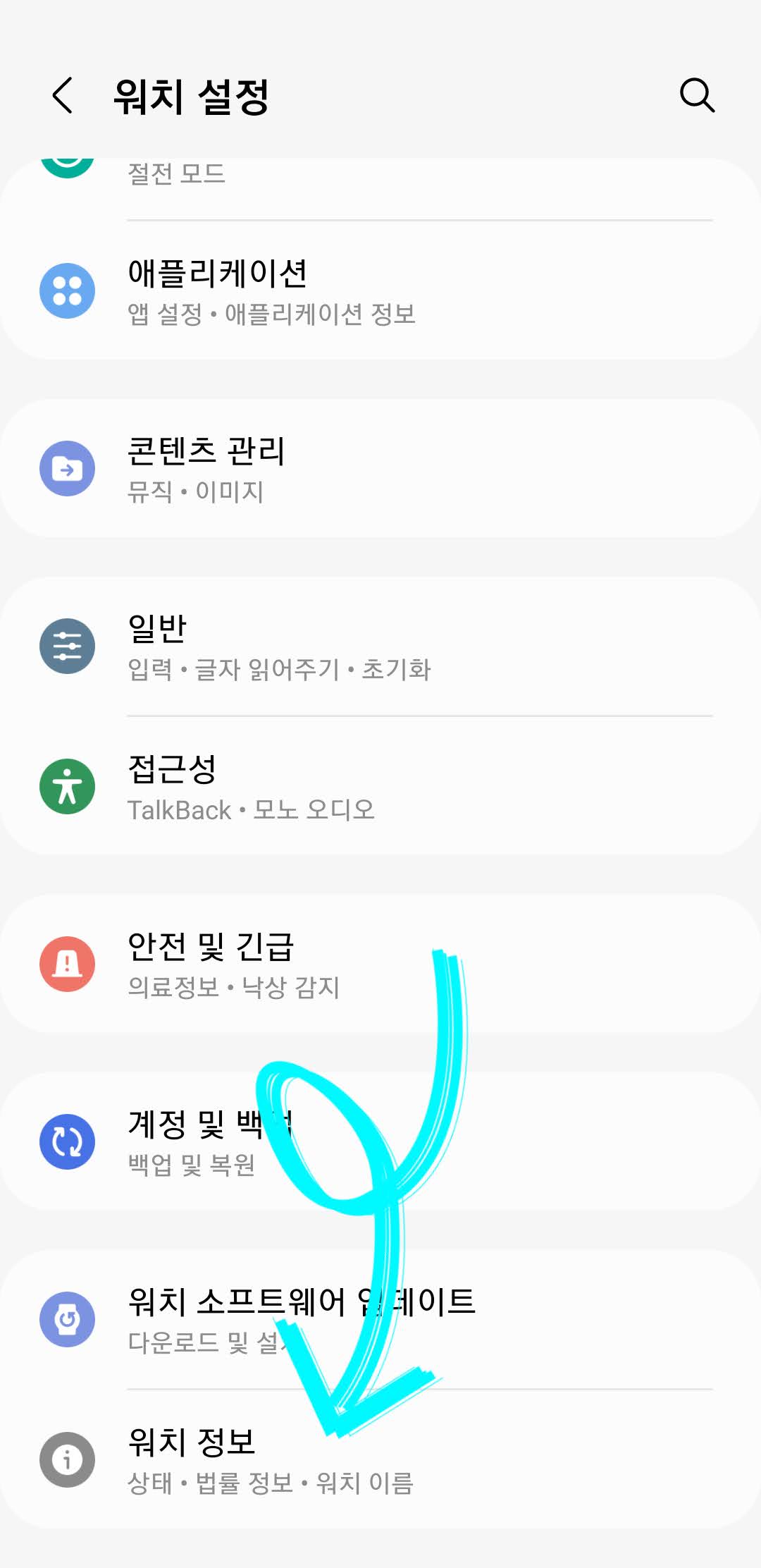 갤럭시 웨어러블 앱 내에서 [워치 설정] - [워치 정보]로 이동합니다. 그리고 [소프트웨어 정보]를 누르면 현재 설치되어 있는 소프트웨어 버전을 확인하실 수 있습니다.