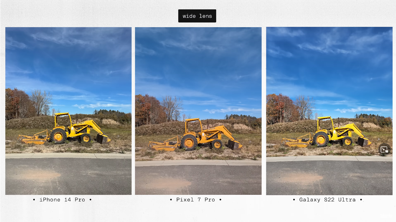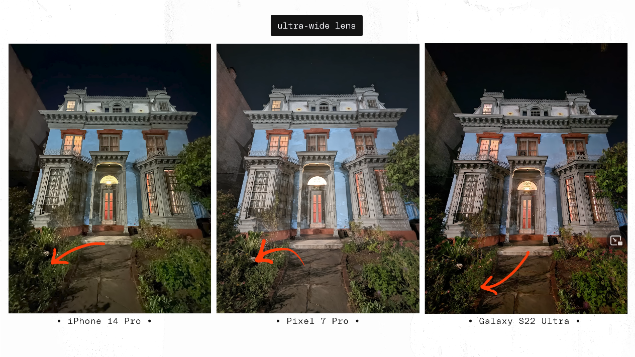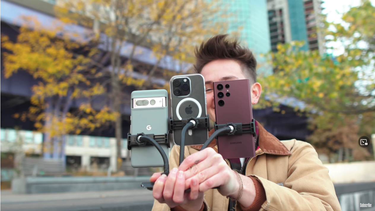 출처: the Verge https://youtu.be/iIBYa1ZEzFQ 앞서 말씀드린 것처럼 아이폰14프로와 갤럭시S22울트라, 그리고 픽셀7프로를 나란히 장착하고 총 1000장의 사진을 찍는 방식으로 진행됐습니다.