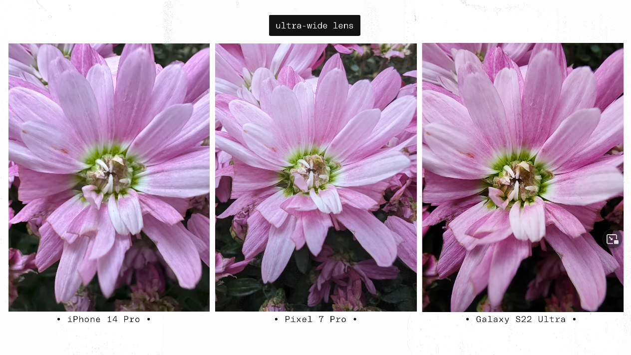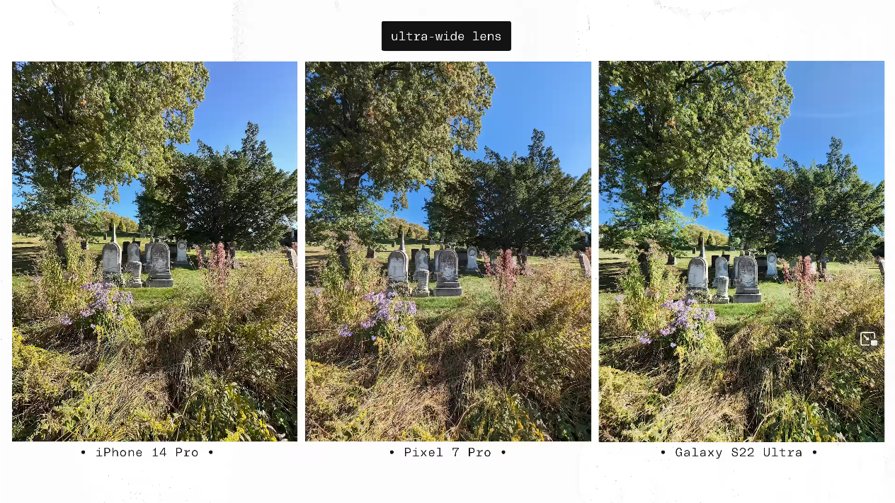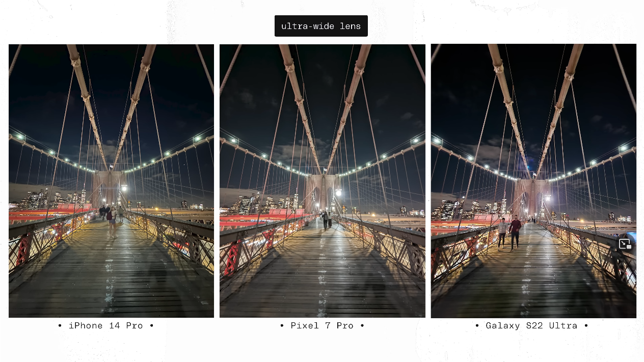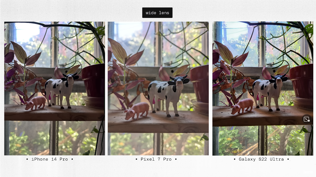 출처: the Verge https://youtu.be/iIBYa1ZEzFQ 앞서 말씀드린 것처럼 아이폰14프로와 갤럭시S22울트라, 그리고 픽셀7프로를 나란히 장착하고 총 1000장의 사진을 찍는 방식으로 진행됐습니다.
