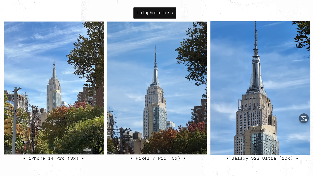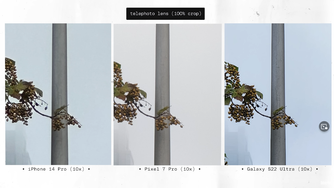 출처: the Verge https://youtu.be/iIBYa1ZEzFQ 그래서 야간/저도도에서는 픽셀7프로의 5배 줌이 아이폰14 프로 대비 좀 더 선명한 결과물을 보여준다고 했고, 주간에서는 S22 울트라가 최상급이라고 하면서, 픽셀과 갤럭시에 각각 점수를 주었습니다.