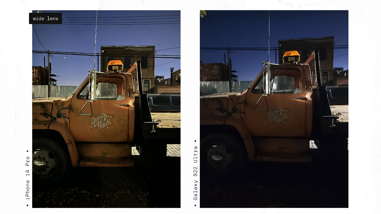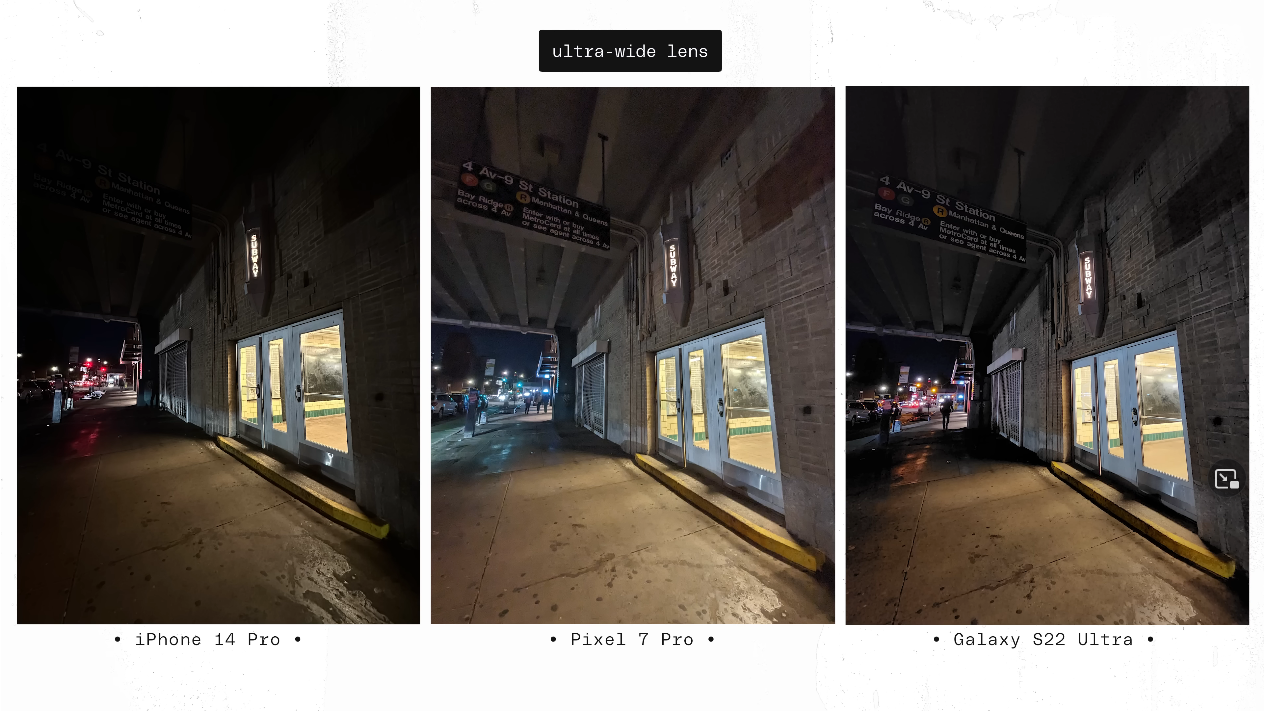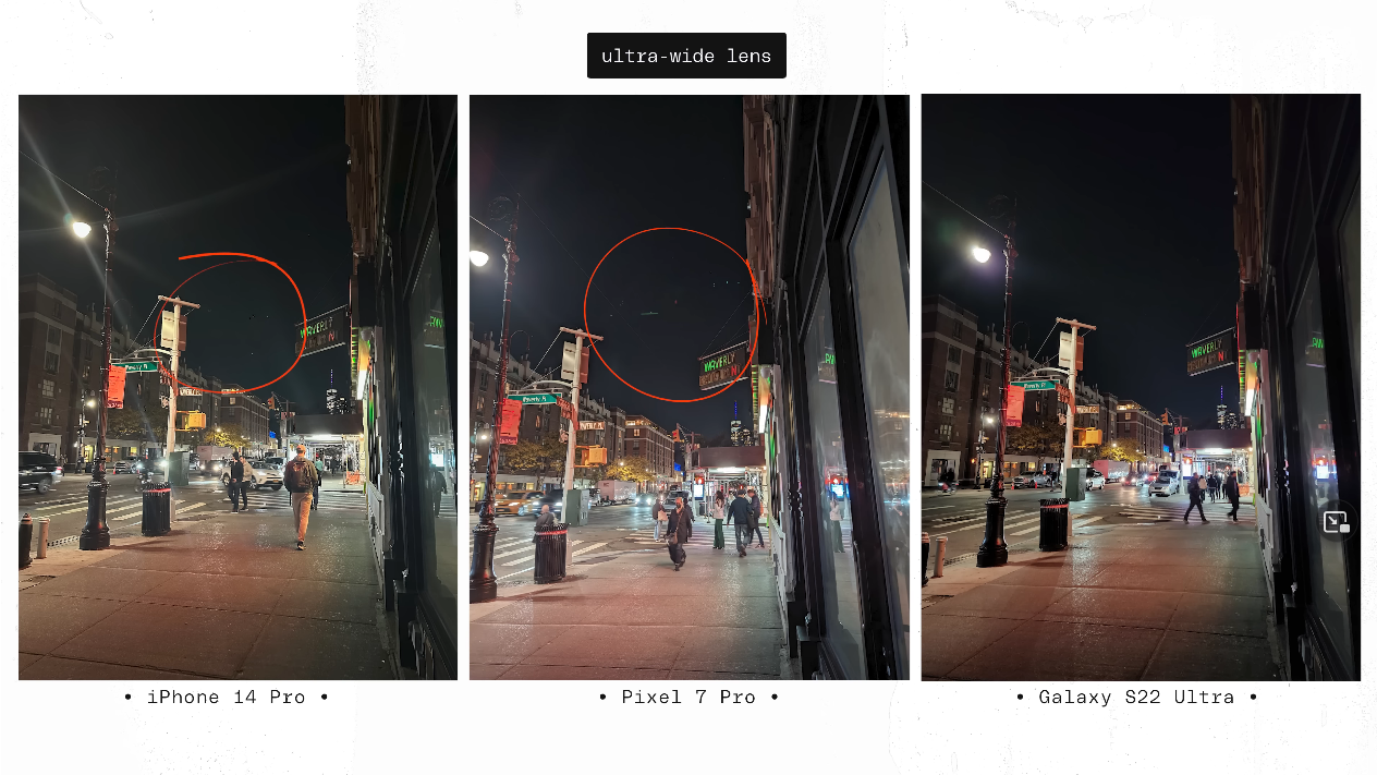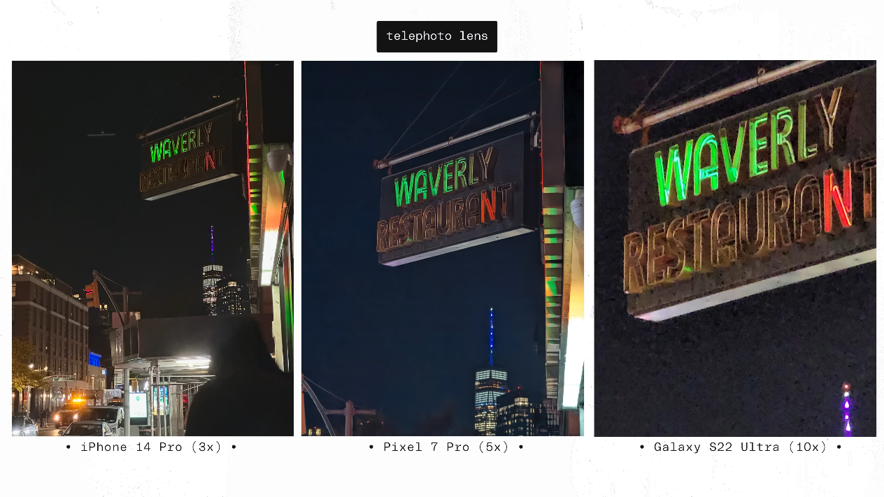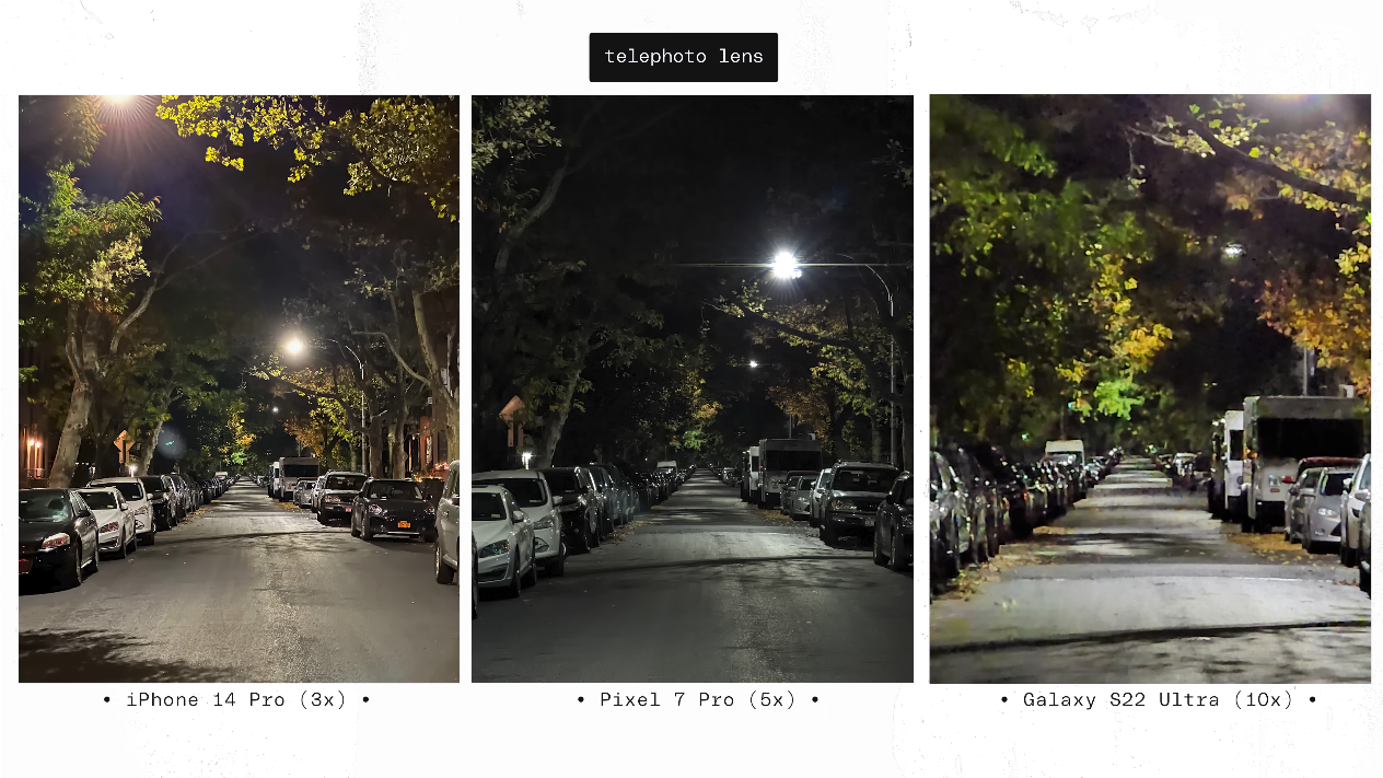 문제는 야간이었는데요, 광학줌 최대치를 놓고 비교하기 위해서 아이폰은 3배, 픽셀은 5배, S22 울트라는 10배를 기준으로 비교를 한 것이지만, S22 울트라의 경우 조리개 값이 4.9 라서 야간/저조도 촬영시 큰 불편이 발생했다고 합니다. 그리고 그에 따른 화질 열화도 많이 일어났다고 합니다. 결과물을 직접 보시죠.