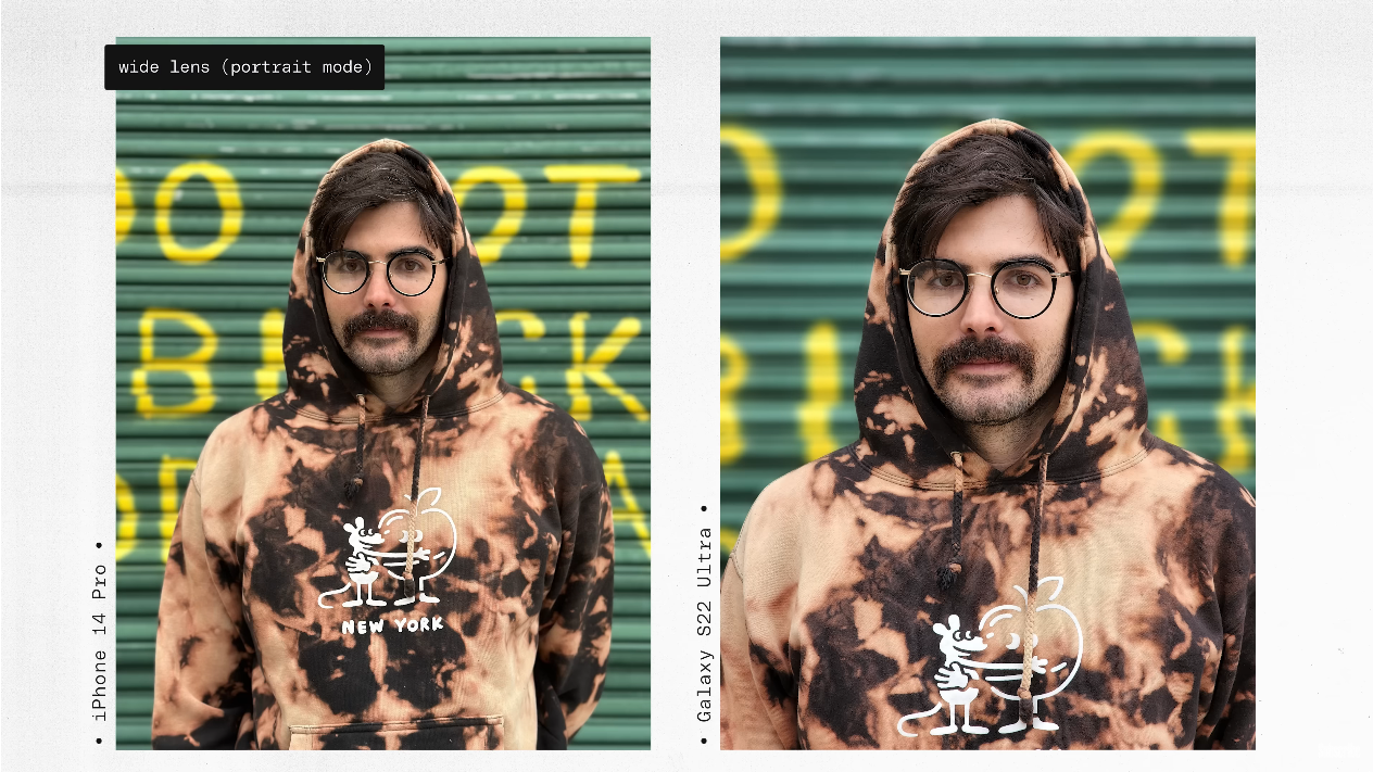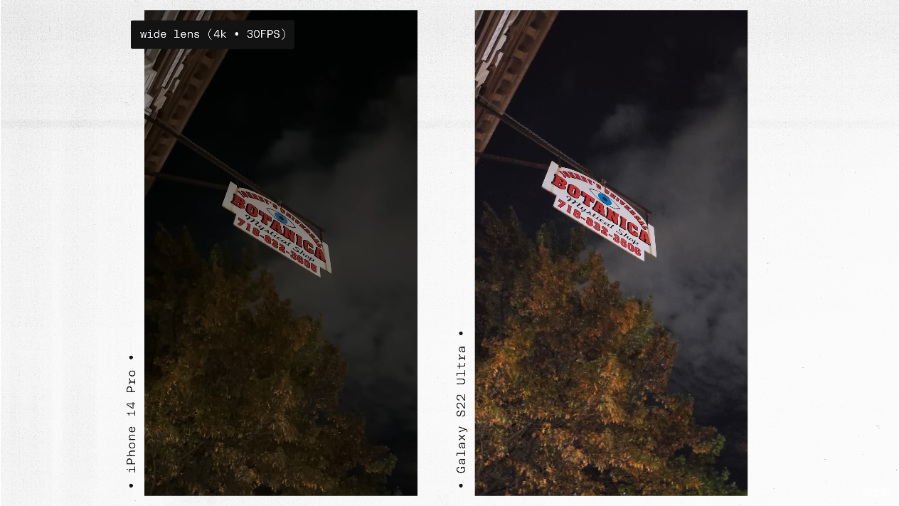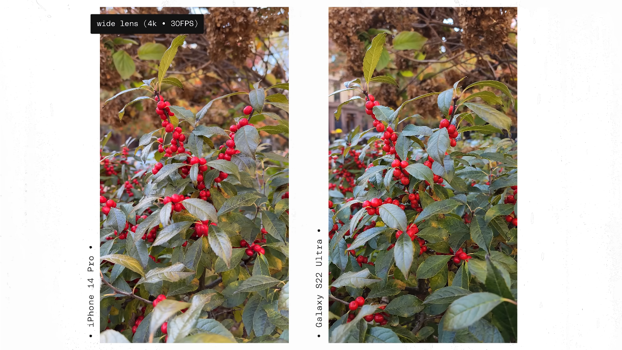 출처: the Verge https://youtu.be/iIBYa1ZEzFQ 아이폰은 동영상 촬영에서도 색깔이나 선명도 등 전체적인 영역에서 아주 일관된 결과물을 보여준다는 점에서 좋은 평가를 받았습니다. 그리고 S22 울트라 대비 약간 더 선명하고 덜 흔들린다고도 하였습니다.
