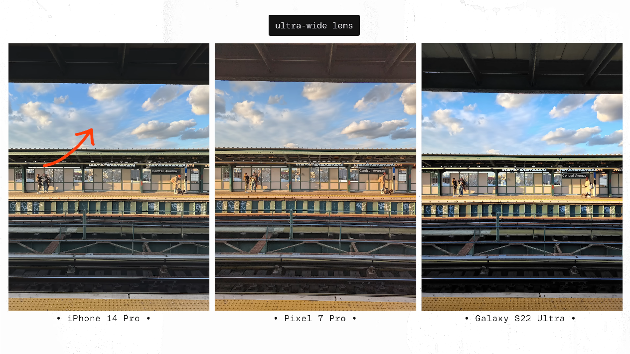 출처: the Verge https://youtu.be/iIBYa1ZEzFQ 가장 먼저 초광각 카메라입니다. 일반적으로 기본 광각 카메라 대비 초광각 카메라는 렌즈 밝기 차이가 있거나, 화질이 다소 떨어지기 마련이죠? 그래서 평가 항목에는 각 렌즈별 색감이나 여러 특성이 얼마나 균일한지 여부도 들어 있었습니다.